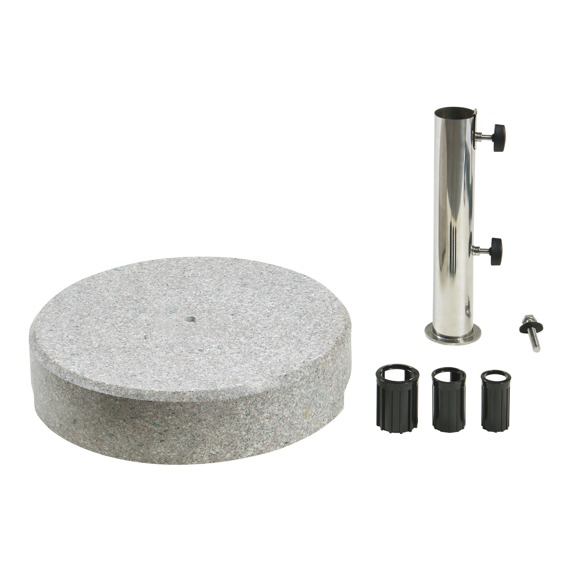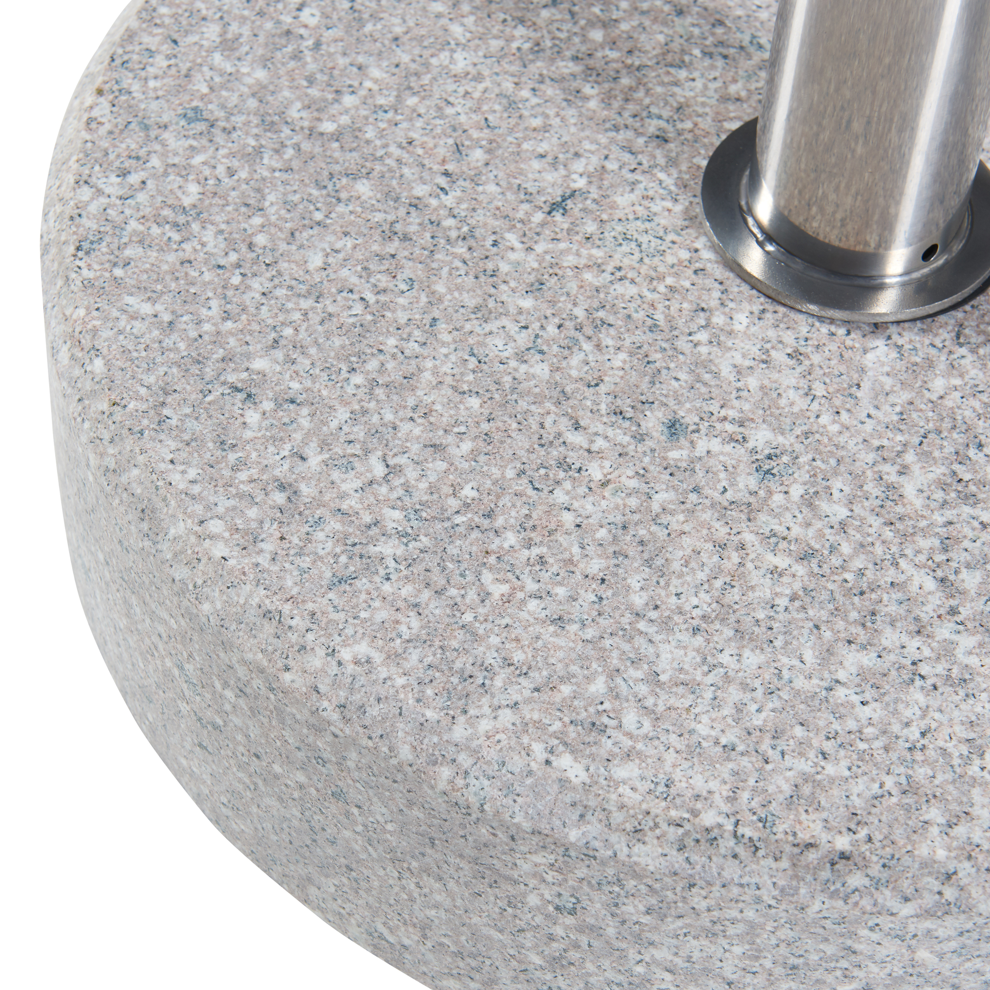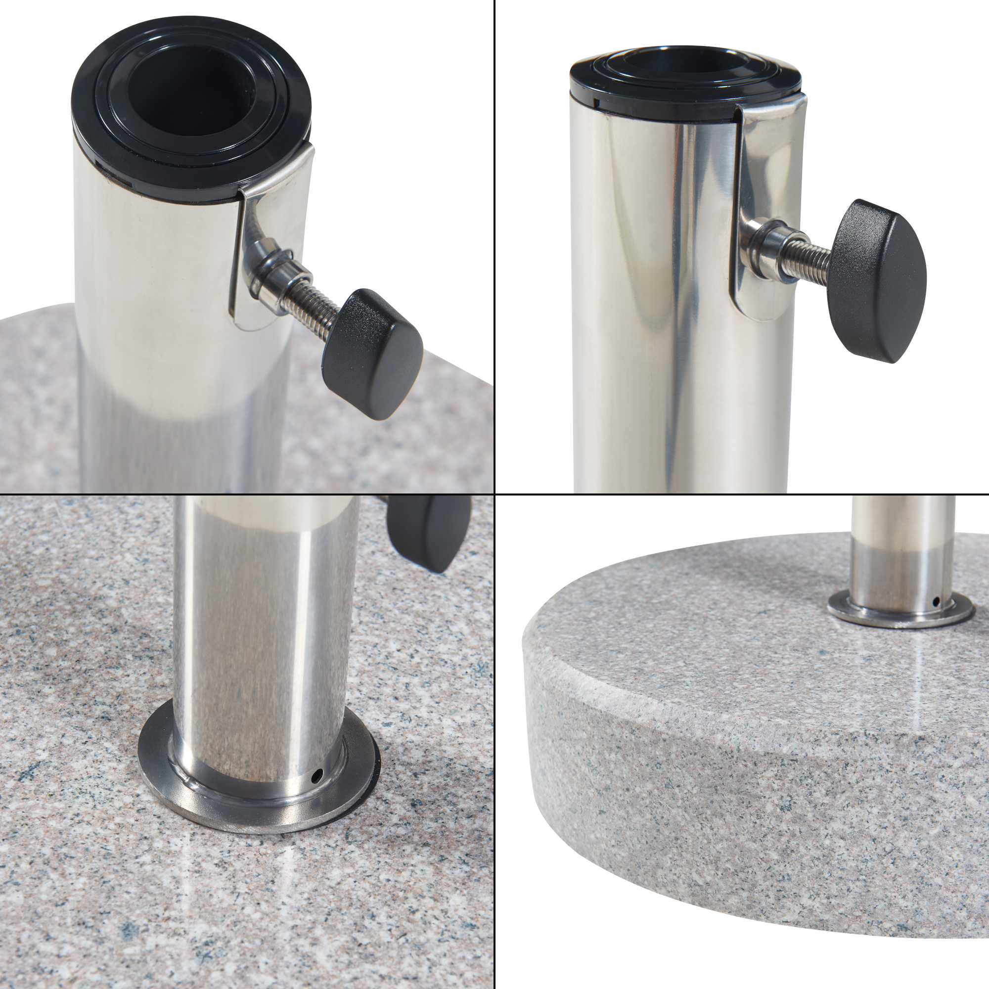 Fiind livrat cu 3 inele adaptoare, produsul este compatibil cu tije de umbrelă cu diametrul de 25, 32 și 38 mm, iar fără adaptoare poate susține tije de până la 49 mm. Textura naturală a granitului face ca fiecare exemplar să fie unic, cu variații discrete de nuanță și structură.