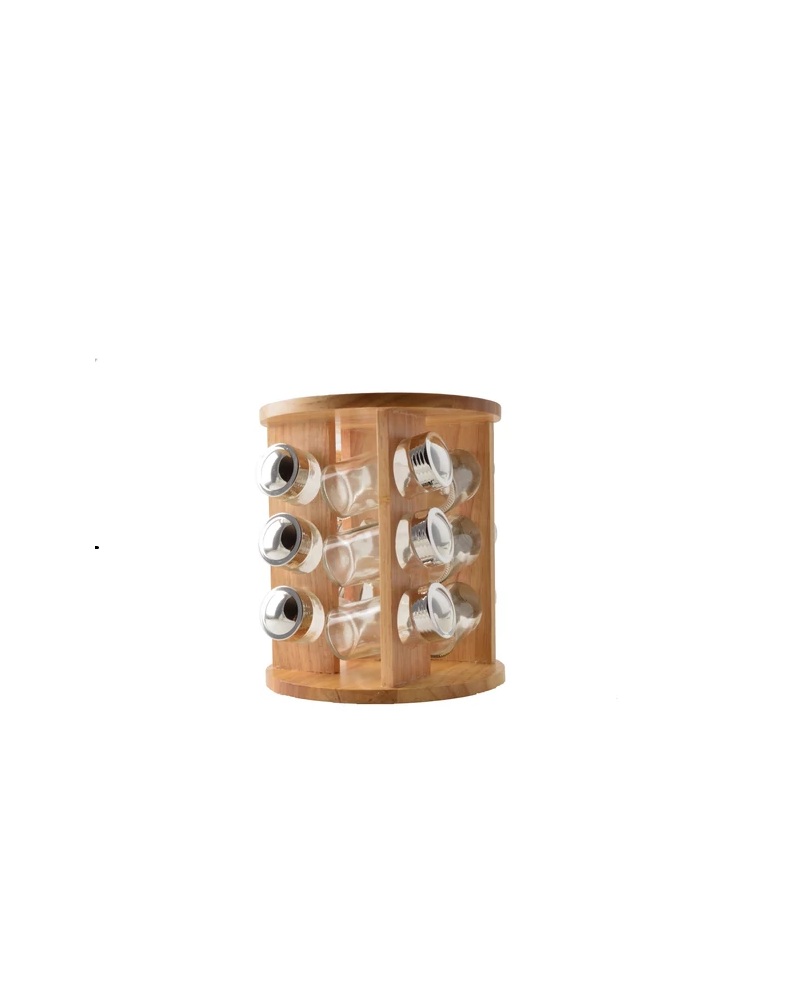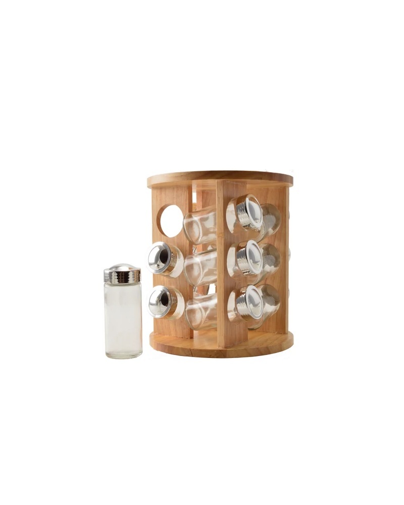 Suport rotativ pentru condimente cu 12 recipiente din sticlă, cu inserții din lemn