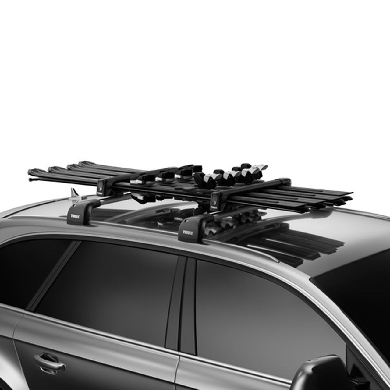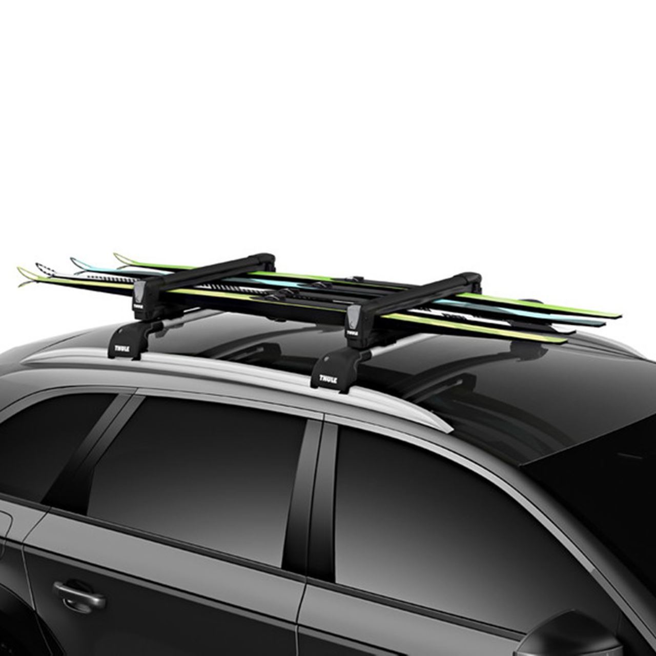 Acest suport pentru schiuri auto se montează direct pe barele transversale din aluminiu cu profil T, folosind accesoriile incluse în pachet. Pentru mașinile cu bare mai apropiate de plafon, înălțarea inclusă ajută la evitarea contactului legăturilor cu acoperișul. Dacă folosești bare din oțel, montajul este posibil cu adaptorul Thule SquareBar Adapter 8897, achiziționat separat.