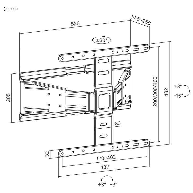 Standard VESA: 100x200, 200x200, 200x300, 300x200, 200x400, 400x200, 300x300, 300x400, 400x300, 400x400