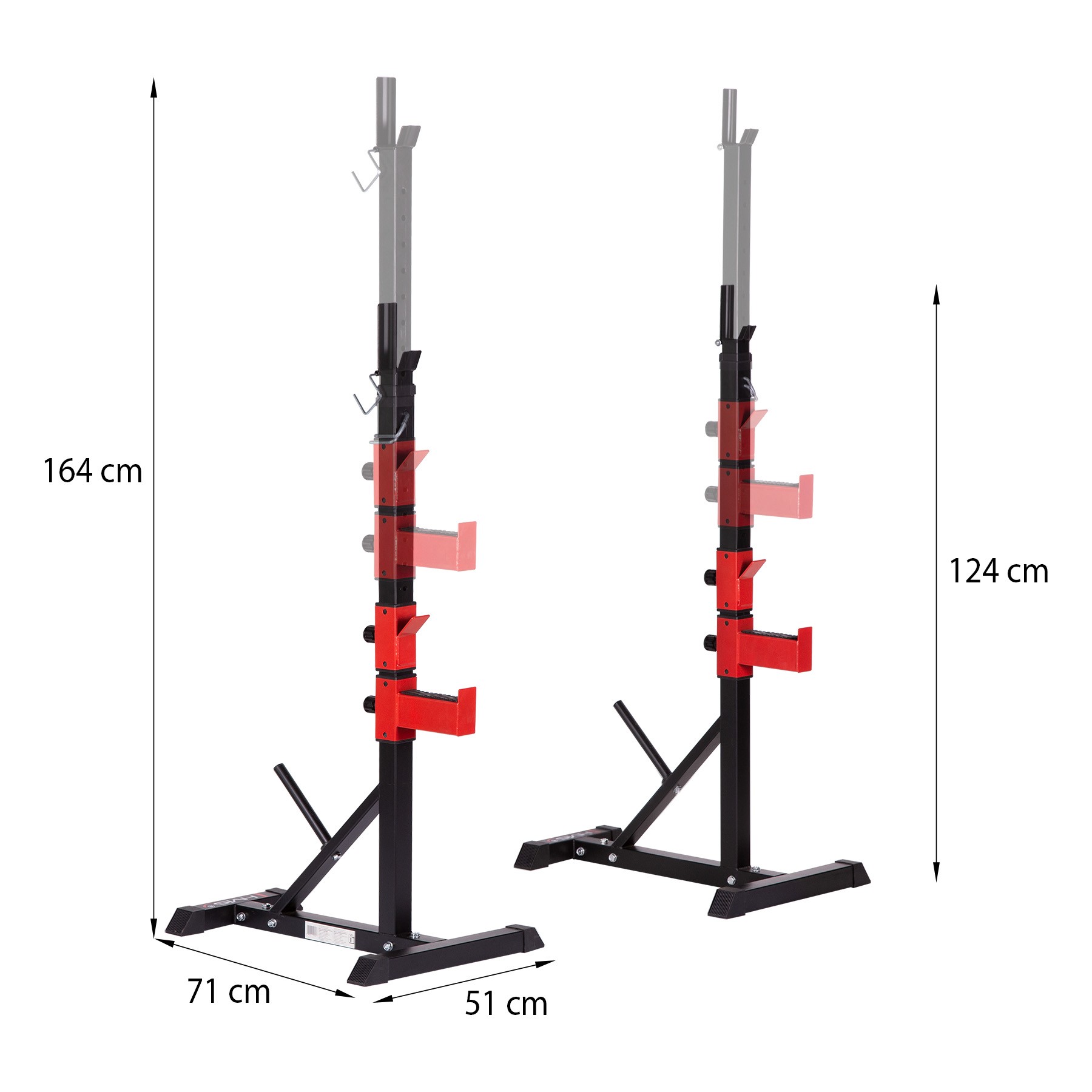 Produsul are suporturi in care care va puteti agata haltera. Unele dintre manere sunt situate chiar in partea de sus a suporturilor, in timp ce celelalte, care sunt situate mai jos, pot fi reglate liber. Suporturile sunt profilate, ceea ce previne alunecarea barei.