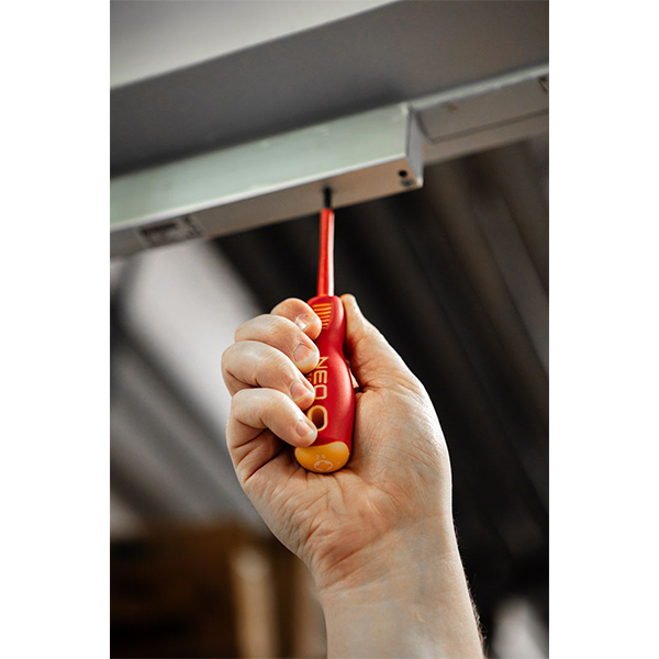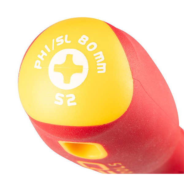 - Unealta care este aprobata pentru lucrul sub tensiune de pana la 1000 V. Lama sa este fabricata din otel CrV durabil, iar varful surubelnitei, tratat termic suplimentar, se caracterizeaza printr-o duritate corespunzatoare si rezistenta la indoire. Dimensiunea varfului acestui model este SL/PH1, unde lungimea lamei este de 80 mm.