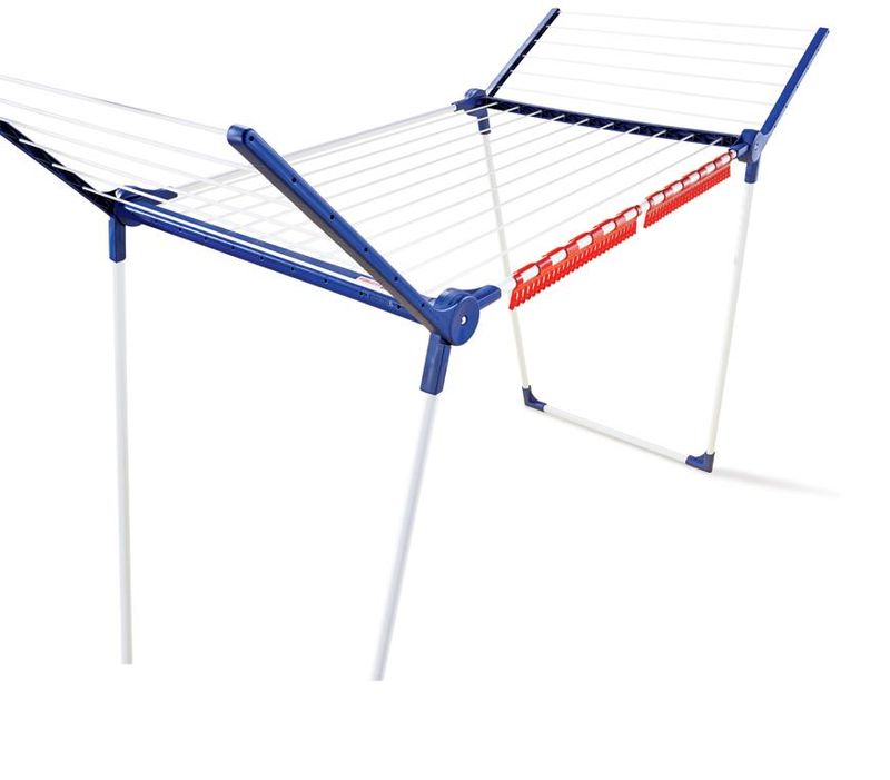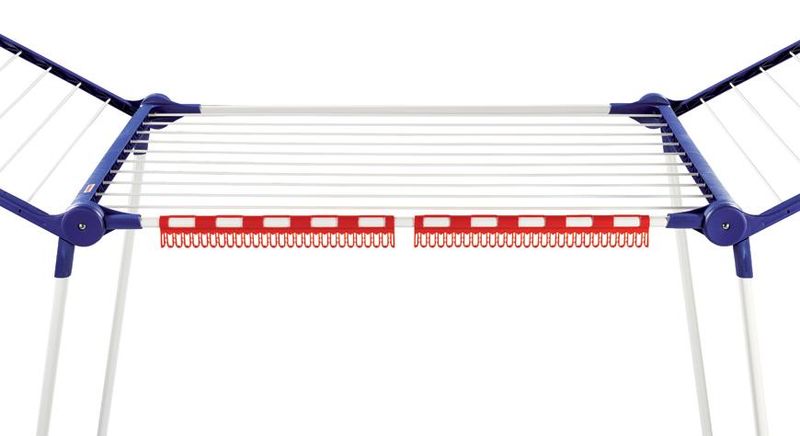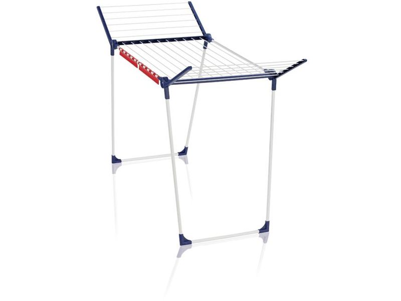 Stabilný sušiak na bielizeň s výklopnými bočnicami, ideálny pre vnútorné aj vonkajšie použitie, 18 m sušiacej plochy = až 2 práčky bielizne, výška sklápacích bočníc 105 cm, možnosť zavesenia dlhých kusov odevov, vrátane 2 easyclipov na sušenie drobnej bielizne, záruka 5 rokov.