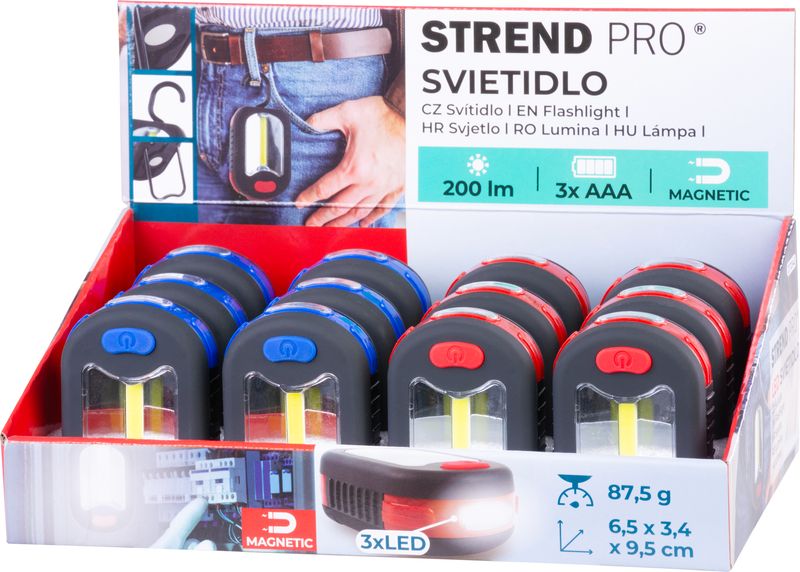 Svietidlo Strend Pro Worklight, prívesok, LED 200 lm, magnet, s klipsou, červená/modrá, 3x AAA, Sellbox 12 ks