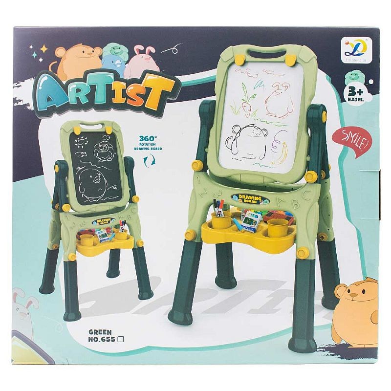 Copilul dumneavoastra s-a plictisit de traditionala tabla de scris? Alegeti un model de tabla de 2 in 1 pentru activitati creative, special creata pentru micii artisti. Aceasta are 2 fete: una alba pentru desenat si una neagra pentru scris, ambele fete pot fi folosite in acelasi timp, transformandu-se astfel intr-un joc de grup sau joc pe echipe. Suportul este robust si stabil, permitandu-va o rotatie la 360 grade pentru o utilizare cat mai confortabila.