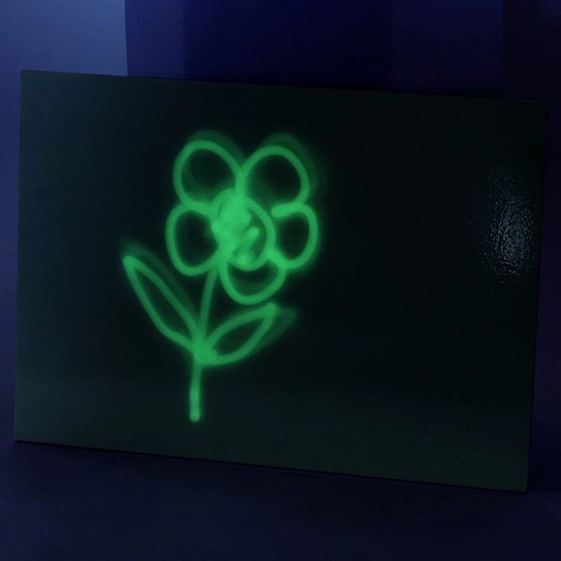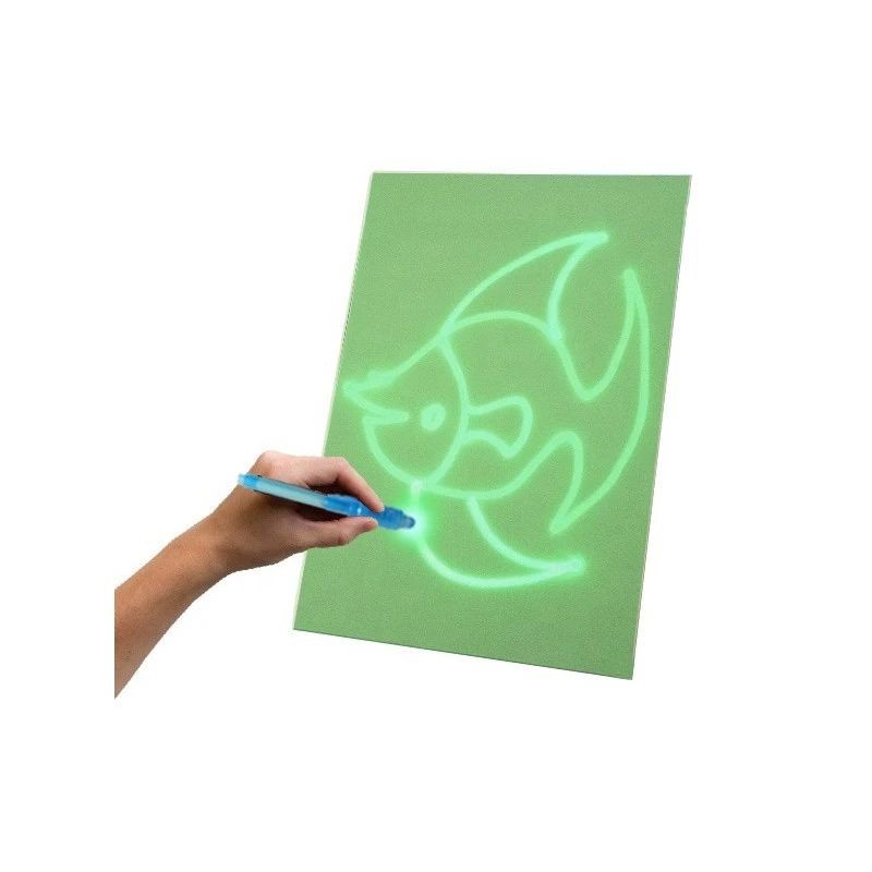Daca desenati un cerc cu lumina UV, acesta ramane vizibil doar timp de cateva minute deoarece actioneaza efectul fosforescent al tablitei, dupa care desenul dispare!