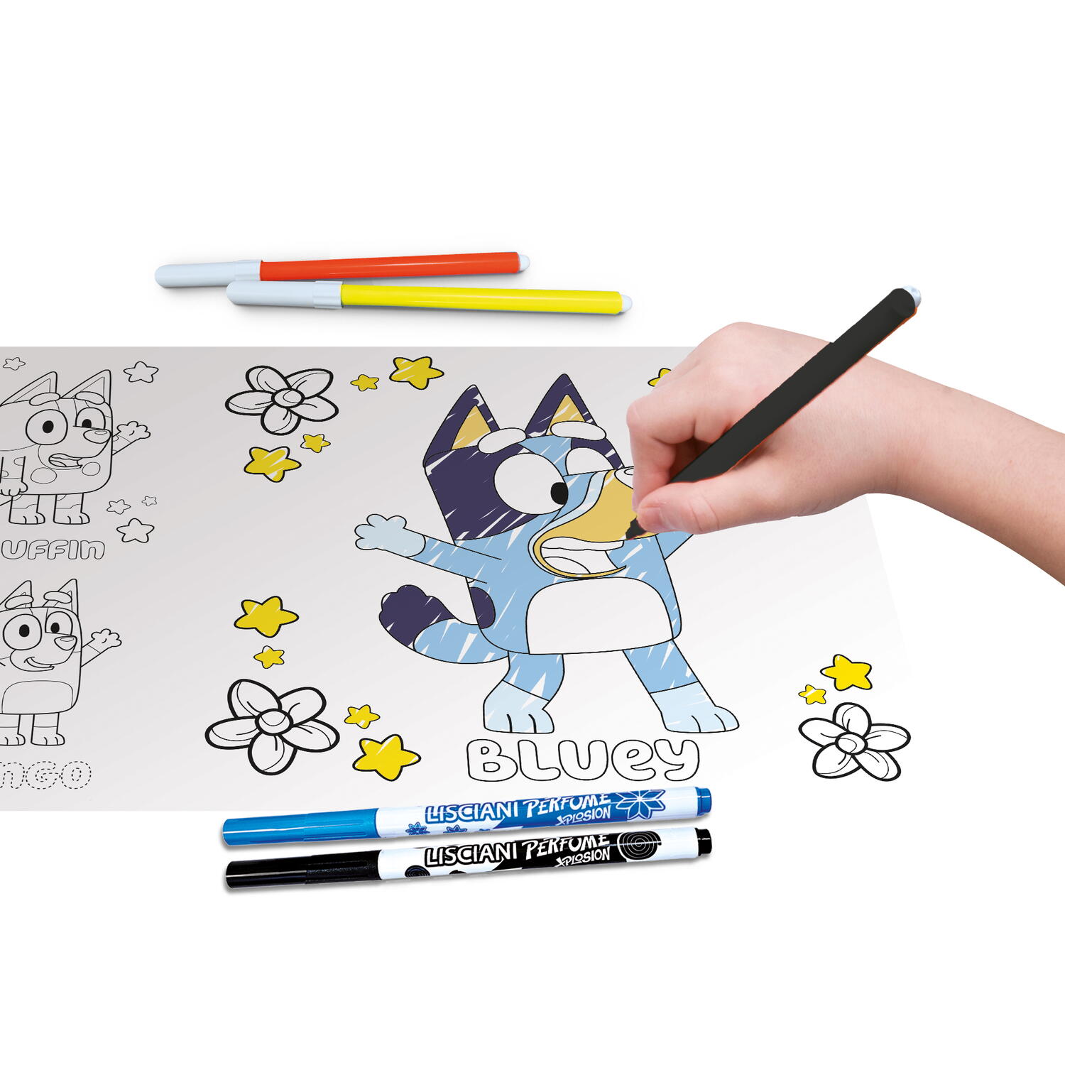 Cu ajutorul planselor, sabloanelor si markerelor parfumate, cei mici pot recrea personajele preferate din Bluey si isi pot exersa imaginatia, coordonarea mana-ochi si indemanarea. Efectul luminos ofera un plus de distractie si scoate in evidenta fiecare desen.