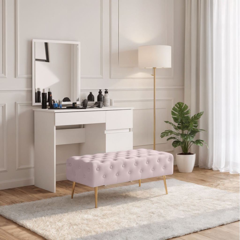 Taburet banca Monaco din catifea roz pudra, cu picioare metalice, 100 cm