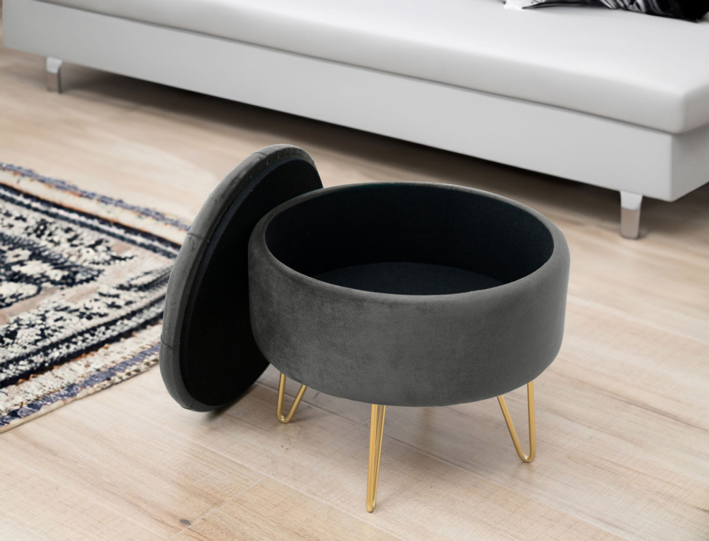 Taburetul Caro gri cu spatiu de depozitare este alegerea potrivita daca iti doresti o piesa de mobilier practica si eleganta pentru living, dormitor sau hol. Tapiteria din velur ofera un aspect rafinat si o textura placuta la atingere, iar baza din otel cu finisaj auriu completeaza perfect stilul modern cu accente glam.