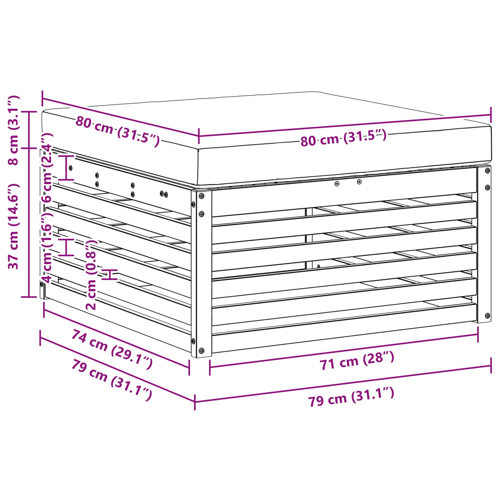 - 1 x Otoman: 79 x 79 x 37 cm (LxWxH)