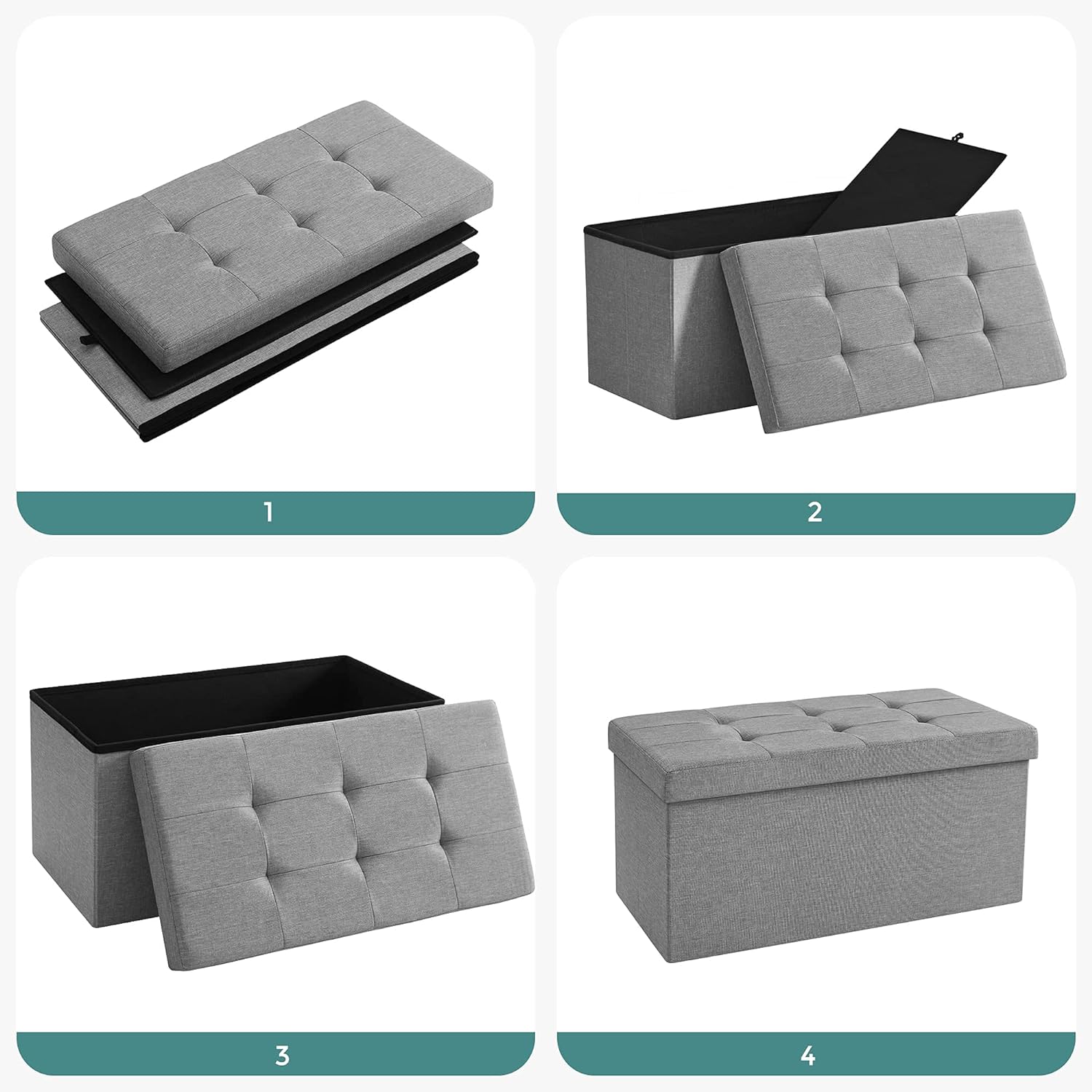 Alege un taburet pliabil cu spatiu de depozitare care imbina perfect confortul, ordinea si designul modern. Modelul SONGMICS in nuanta gri deschis este ideal pentru living, dormitor, hol sau camera copiilor, oferind un loc comod pentru sezut si un compartiment generos pentru organizarea obiectelor din casa.