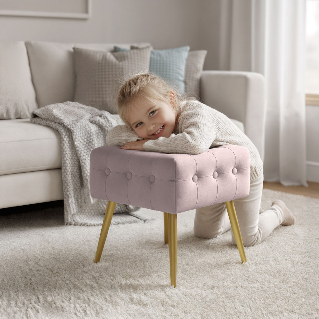 Taburetul tapitat Quadra din velur roz pudra este alegerea potrivita pentru un decor elegant si primitor. Cu forma patrata, capitonaj decorativ si picioare metalice rezistente, ofera confort, stabilitate si un accent rafinat in living, dormitor sau hol.