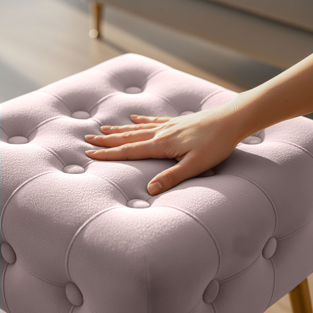 Alege un taburet tapitat care imbina perfect eleganta cu functionalitatea. Modelul Quadra in nuanta roz pudra aduce un plus de rafinament in orice incapere, fie ca il folosesti in living, dormitor, hol sau zona de dressing. Tapiteria din velur este placuta la atingere, iar designul patrat cu detalii decorative tip capitonaj ofera un aspect sofisticat si modern.