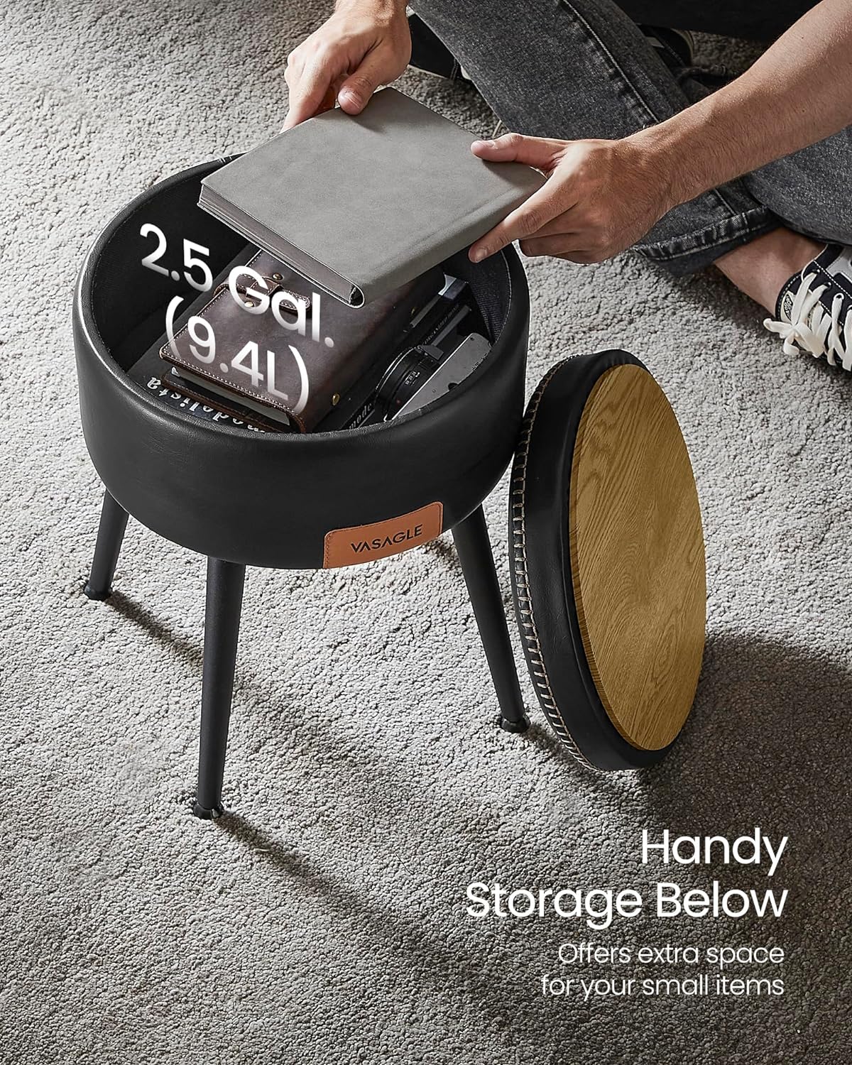 Taburet VASAGLE cu spatiu de depozitare, tapitat PU, negru, 38,2 x 44,4 cm