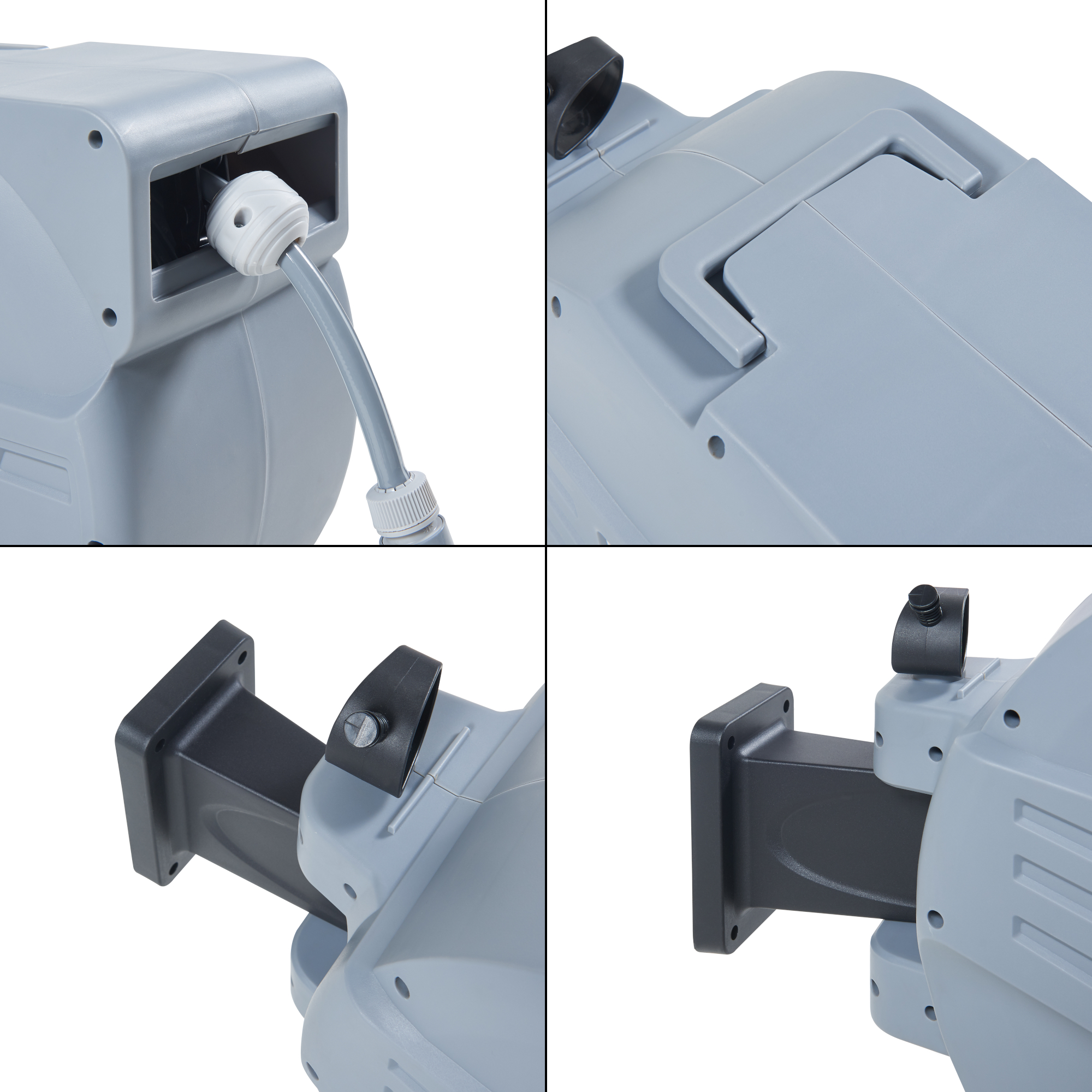 Furtunul se extrage ușor și poate fi blocat în poziția dorită, iar printr-o simplă tragere mecanismul automat de rulare îl retrage curat și uniform. Suportul de perete inclus permite montaj rapid, iar sistemul cu rotire la 180° oferă libertate de mișcare în mai multe direcții. Mânerul ergonomic permite și transportul facil, dacă doriți să folosiți tamburul fără montaj fix.