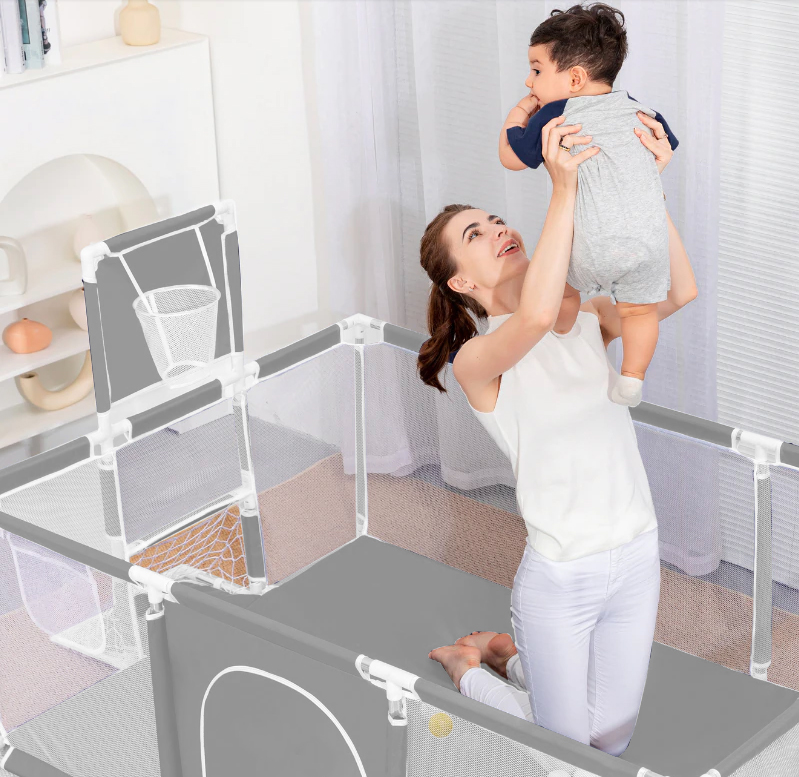 Tarc de joacă XXL pentru copii și bebe, gri, cu coș baschet, 230x122x62 cm