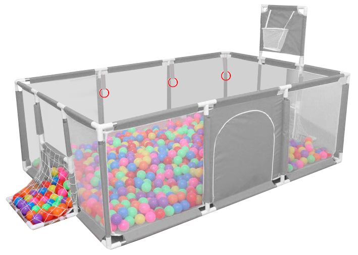 Modelul este prevăzut cu intrare cu fermoar, astfel încât accesul copilului se face ușor și în siguranță. În plus, include elemente distractive precum coș de baschet detașabil și două panouri laterale cu porți pentru mingi, transformând spațiul într-un adevărat loc de joacă pentru copii. Este o alegere excelentă atât pentru joaca de zi cu zi, cât și pentru vacanțe sau vizite, datorită montajului facil.