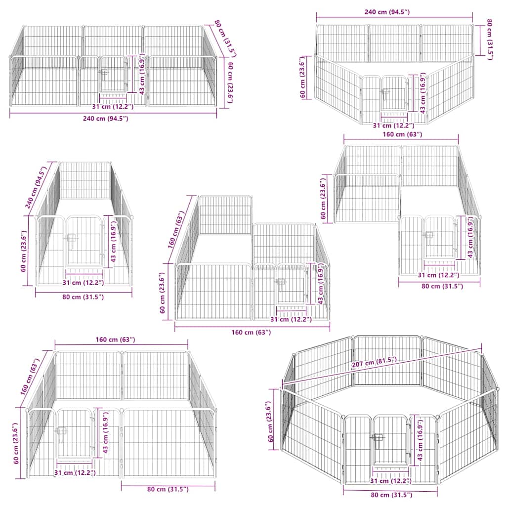 Acest padoc de câini poate fi instalat sau demontat cu ușurință. Este format din 8 panouri grele și fiecare panou poate fi ușor atașat la următorul, ceea ce vă permite să configurați țarcul în diferite forme. Țarcul pentru câini are o ușă articulată cu zăvor de siguranță pentru acces ușor. Acest padoc de câini durabil și rezistent la intemperii este fabricat din oțel vopsit electrostatic, rezistent la rugină, ceea ce îi oferă durabilitate atât pentru utilizarea în exterior, cât și în interior. Țărușii incluși asigură fixarea locului de joacă în aer liber pentru o stabilitate și o securitate sporită.
