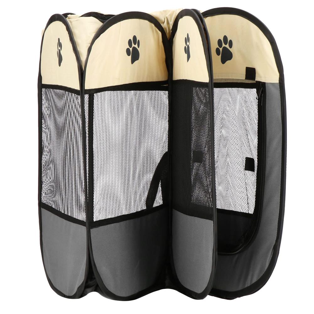 Ofera-i prietenului tau blanos un spatiu sigur si confortabil cu acest tarc pliabil pentru animale de companie, ideal pentru caini de talie mica, catei, pisici si alte animale mici. Designul octogonal, materialul textil rezistent si panourile din plasa asigura ventilatie excelenta, vizibilitate buna si un loc practic pentru joaca, odihna sau dresaj, atat in casa, cat si in exterior.