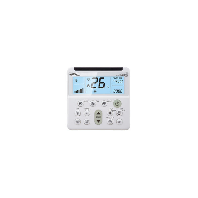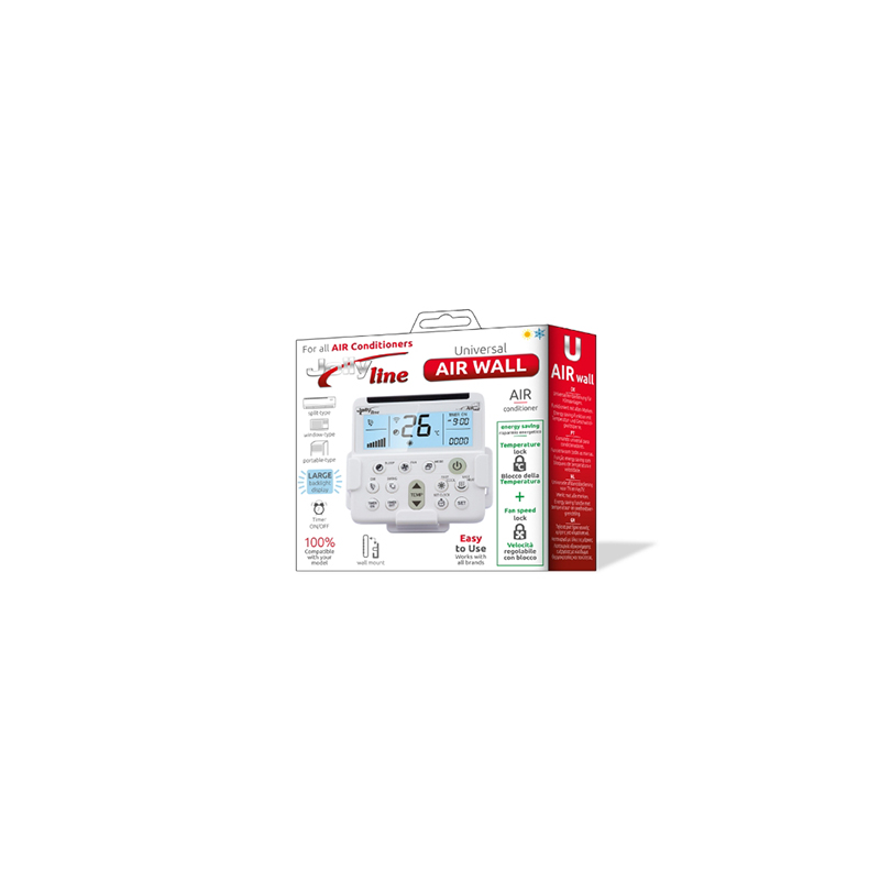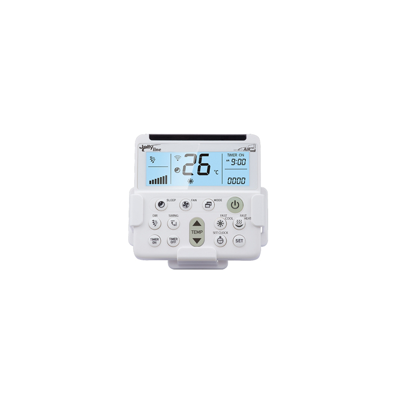 Telecomandă universală pentru aparate de aer condiționat cu afișaj mare, cu iluminare din spate și suport pentru fixare pe perete.