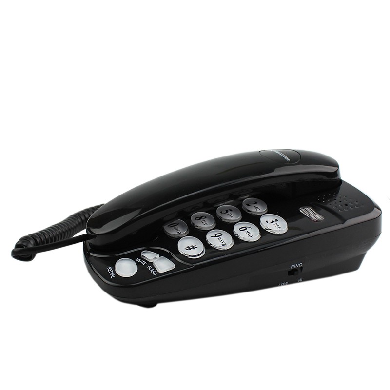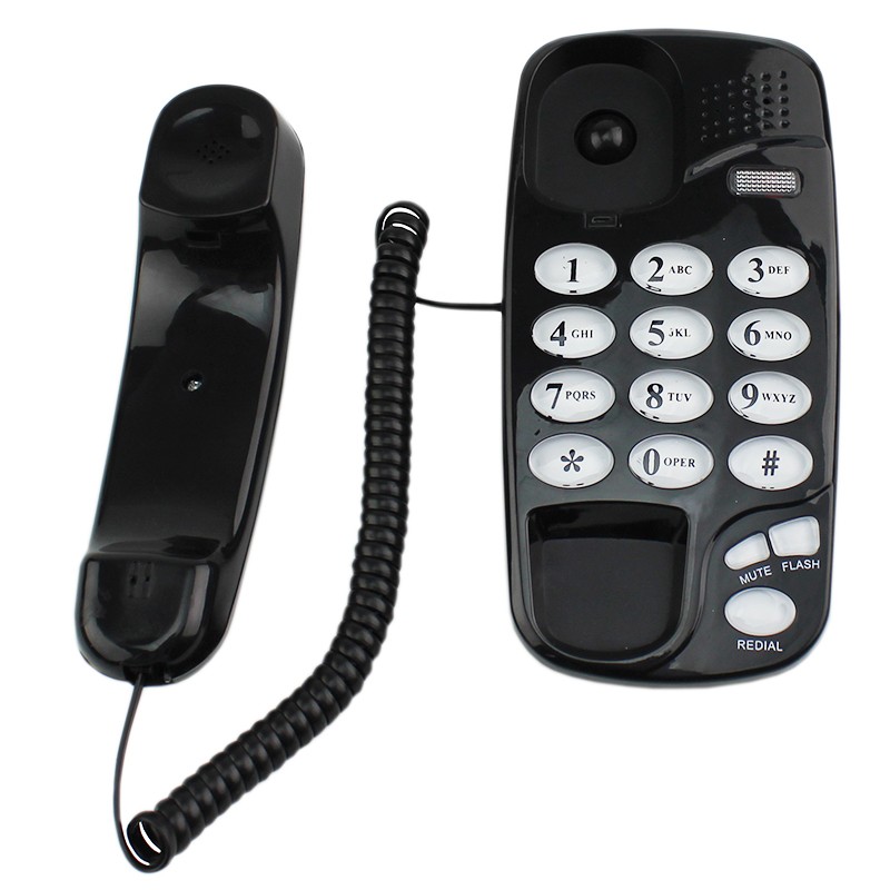 Telefon fix cu fir negru, montabil pe perete, cu tastatură iluminată și Redial