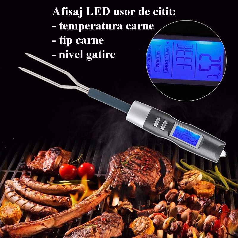 Termometru digital pentru carne cu sonda tip furculita, 6 tipuri carne, LED