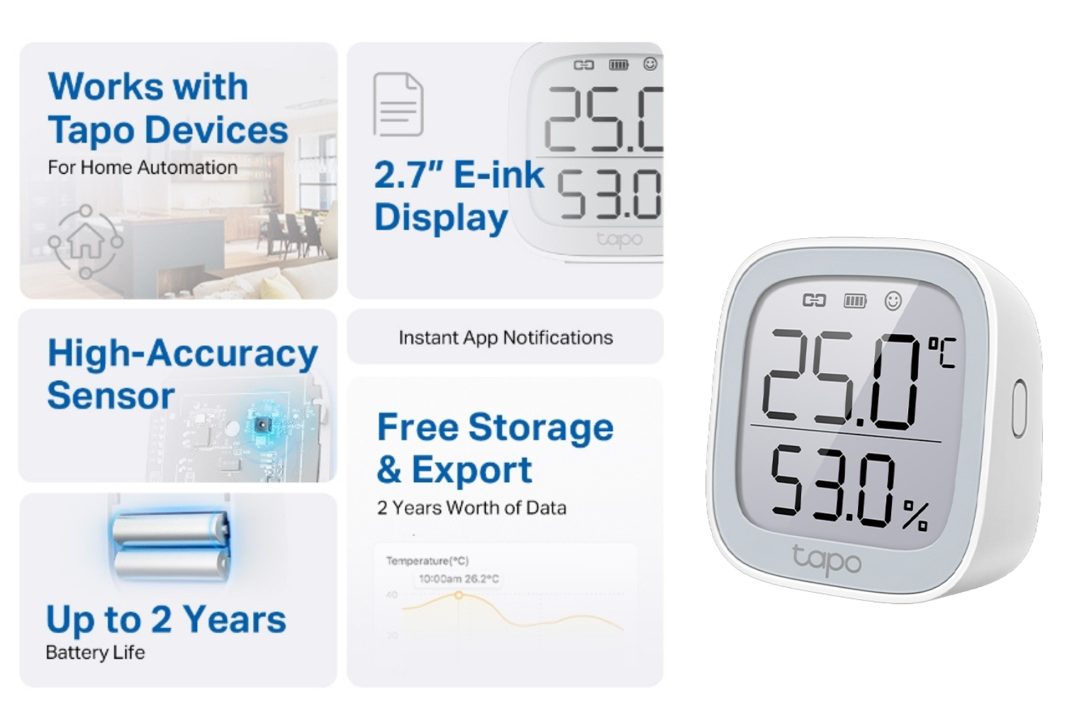 Echipat cu un senzor elvetian integrat, Tapo T315 ofera precizie de ±3%RH si ±0.3C. Datele sunt actualizate la fiecare 2 secunde, asigurand masuratori constante si exacte.