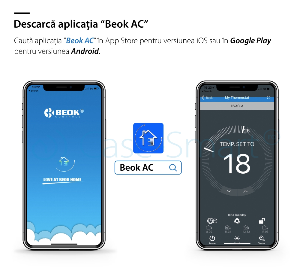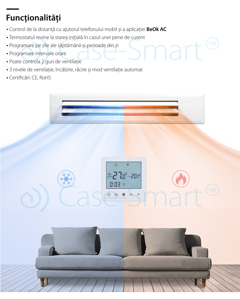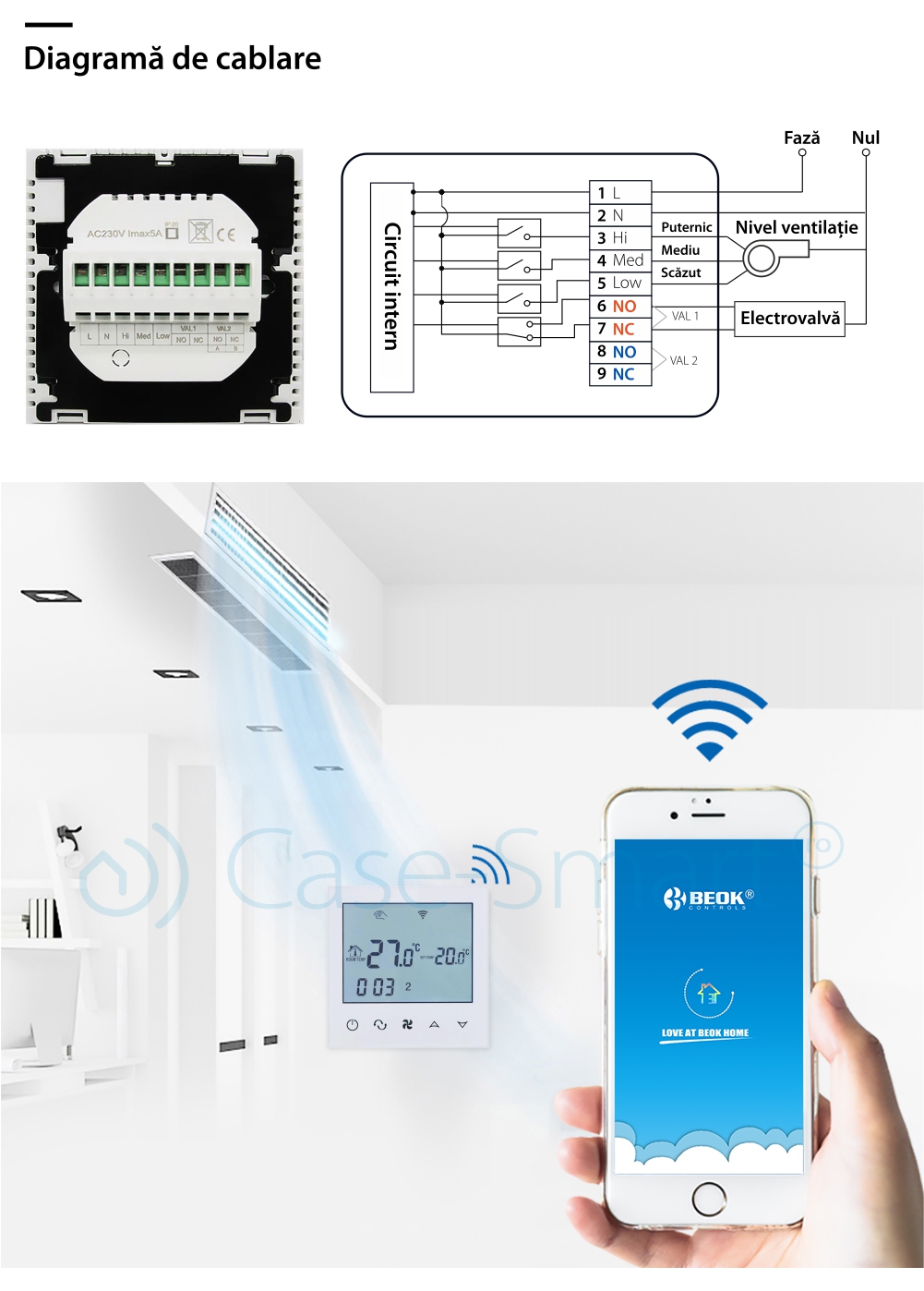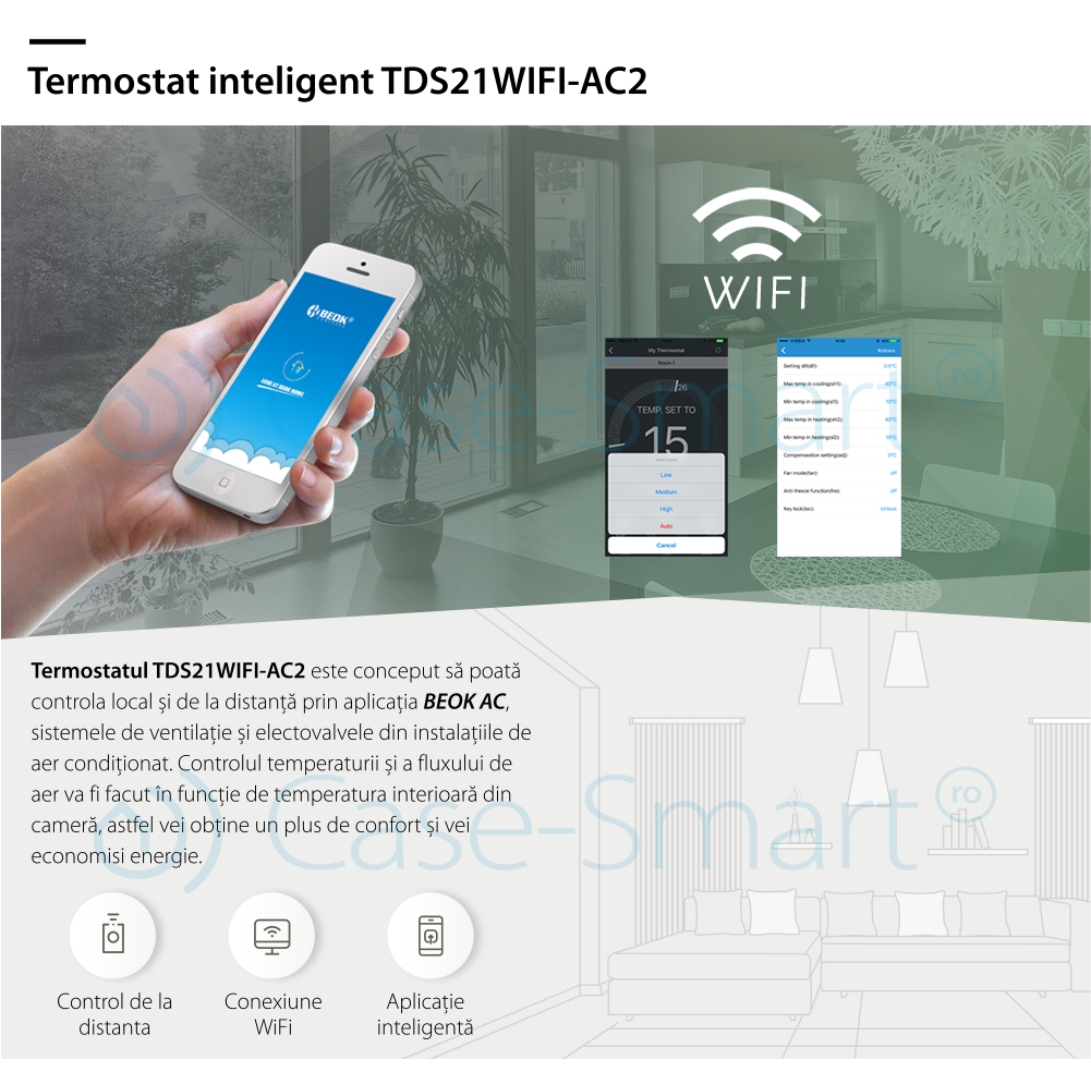 Termostat cu fir pentru aer conditionat BeOk TDS21WIFI-AC2, Control de pe telefonul mobil, Compatibil cu sisteme HVAC SmartElectro IntelligentHouse