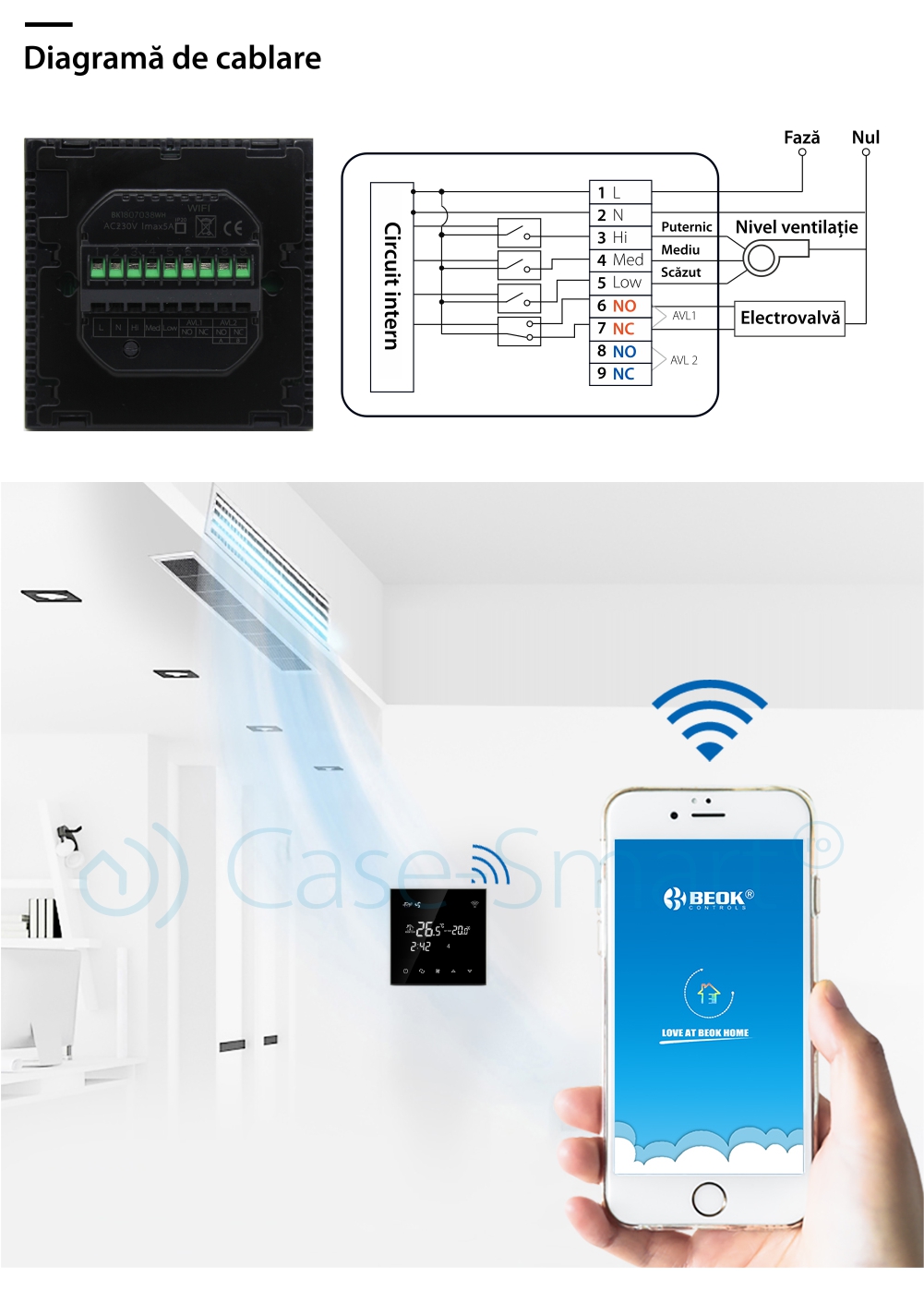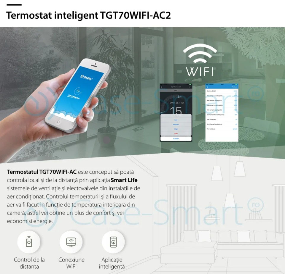 Termostat cu fir pentru aer conditionat BeOk TGT70WIFI-AC2, Aplicatia mobila Smart Life, Compatibil cu sisteme HVAC SmartElectro IntelligentHouse