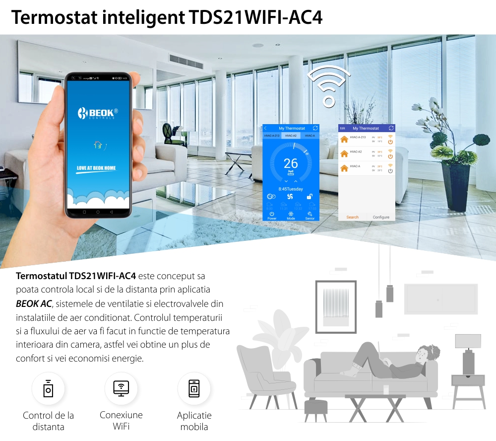 Termostat pentru aer conditionat Beok TDS21WIFI-AC4, Programare, Control aplicatie SmartElectro IntelligentHouse