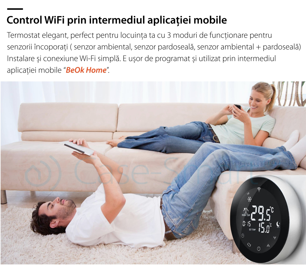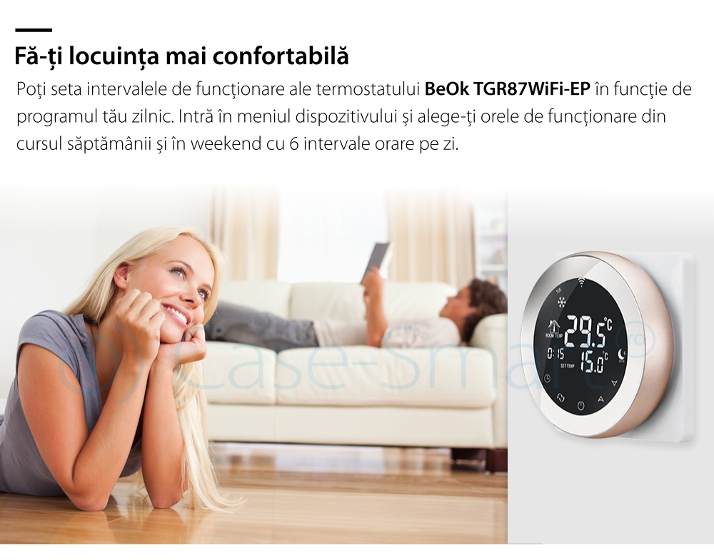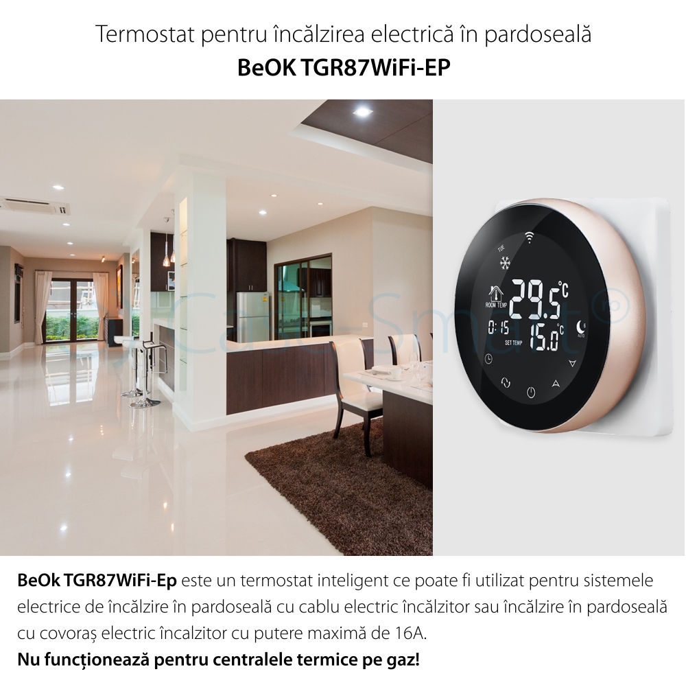 Termostat Wireless pentru incalzirea electrica in pardoseala Beok TGR87WiFi-EP, Functie Anti-inghet, Setare interval de functionare, Control de pe telefonul mobil SmartElectro IntelligentHouse