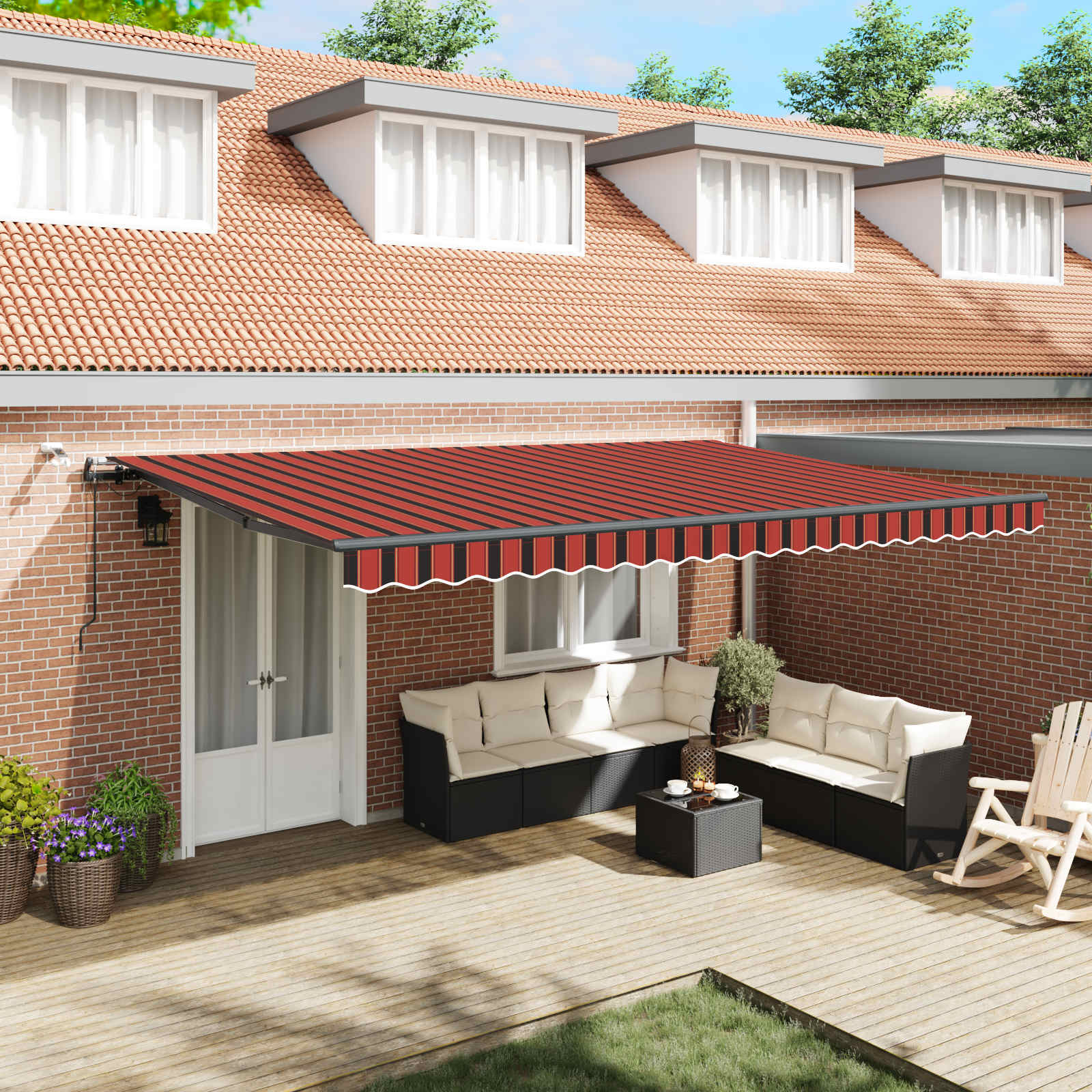 Materialul pentru marchiză e creat să ofere o umbră stilată și practică pentru toate tipurile de spații exterioare. Forma sa dreptunghiulară e ideală pentru balcoane, grădini și terase cu un design modern, cu linii curate. E locul perfect pentru a te relaxa sau a organiza întâlniri pe timp de vară, îmbunătățindu-ți atmosfera de exterior. Se integrează bine în orașe sau la țară, fiind perfectă pentru zilele călduroase.