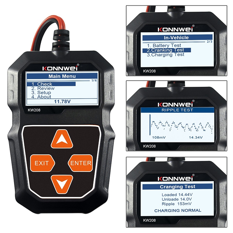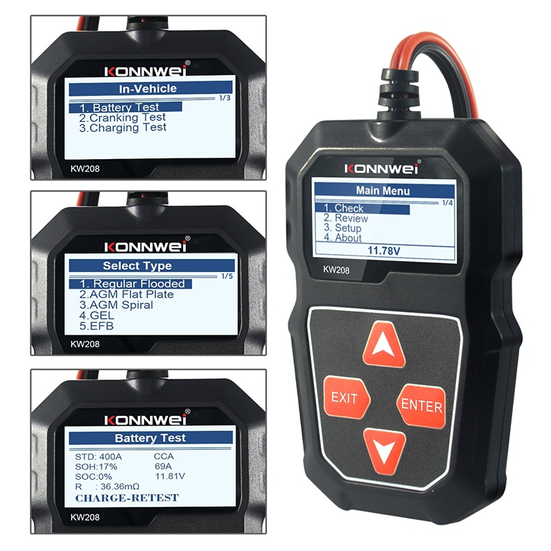 Testerul de baterii auto KONNWEI KW208 12V este capabil sa analizeze si sa citeasca in mod eficient datele importante ale bateriei masinii, cum ar fi tensiunea, rezistenta interna, capacitatea de pornire la rece si capacitatea in AH, starea bateriei si starea de incarcare. Ofera rezultate precise, calculeaza capacitatea de pornire la rece a bateriei si amploarea imbatranirii, permitand o reparatie mai rapida si mai precisa a masinii. Ecran principal de 2,4 ”iluminat