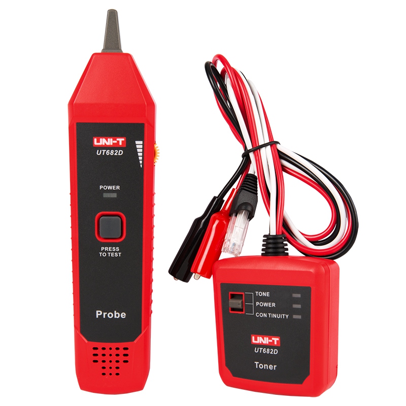Uni-T UT682D este un tester de cablu format din transmițător și receptor, creat pentru testare continuitate și identificare traseu la cabluri de Ethernet (RJ45), telefon și linii electrice. Este o alegere practică pentru instalatori și depanare rapidă în teren.