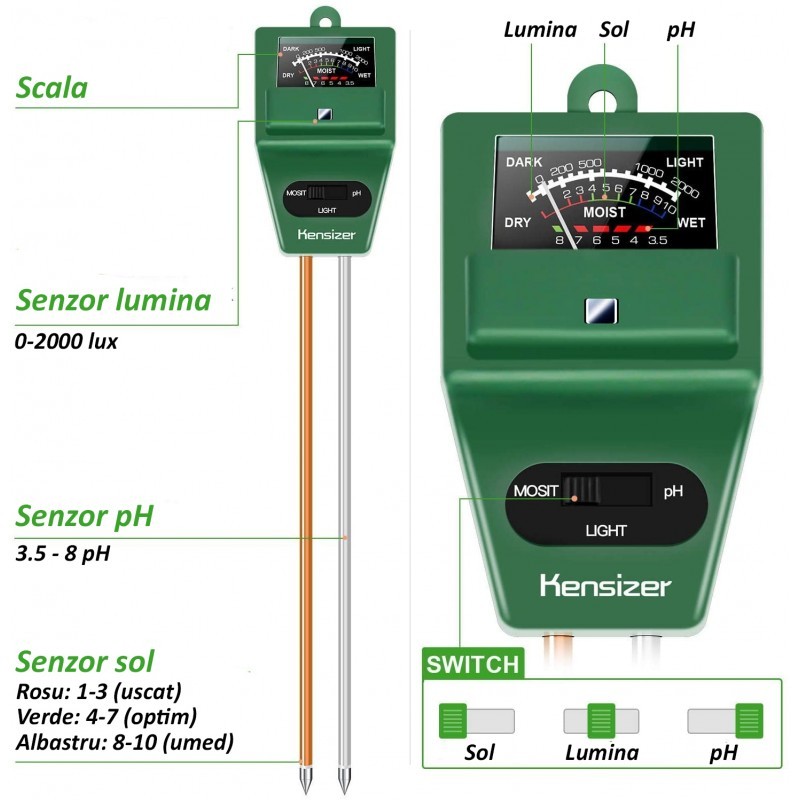 - Citeste valoarea de pe scala si ajusteaza udarea, amplasarea sau substratul
