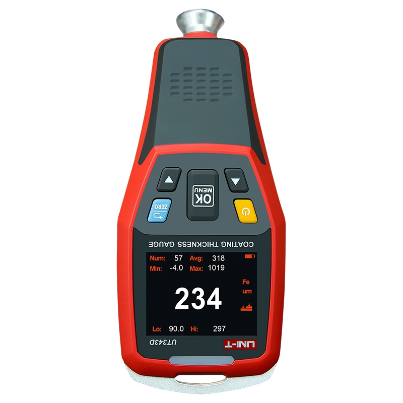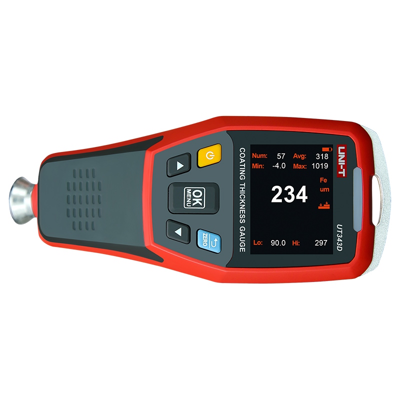 Testerul pentru măsurare grosime vopsea UT343D poate măsura grosimea acoperirii pe materiale feroase și neferoase. Acest dispozitiv este proiectat cu o caracteristică unică de testare rapidă, care permite utilizatorilor să stabilească rapid grosimea și utilizează un LED cu 3 culori și o alarmă audio pentru a determina rapid dacă acoperirea testată se încadrează în domeniul presetat, crescând considerabil eficiența de lucru.