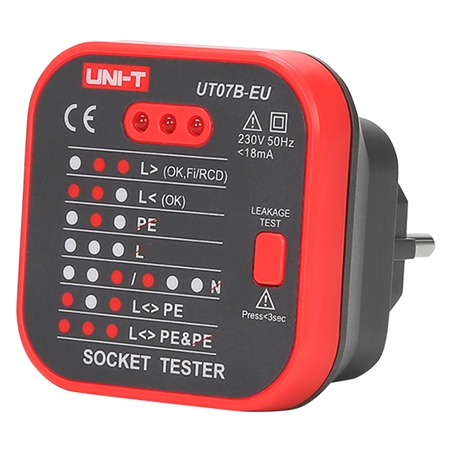 Testerul de priză Uni-T UT07B te ajută să verifici rapid și în siguranță starea unei prize de 230V: polaritate, împământare și posibile conexiuni greșite. Cu afișaj LED ușor de citit și funcție de test RCD, este util atât pentru uz casnic, cât și pentru verificări rapide în instalații electrice.