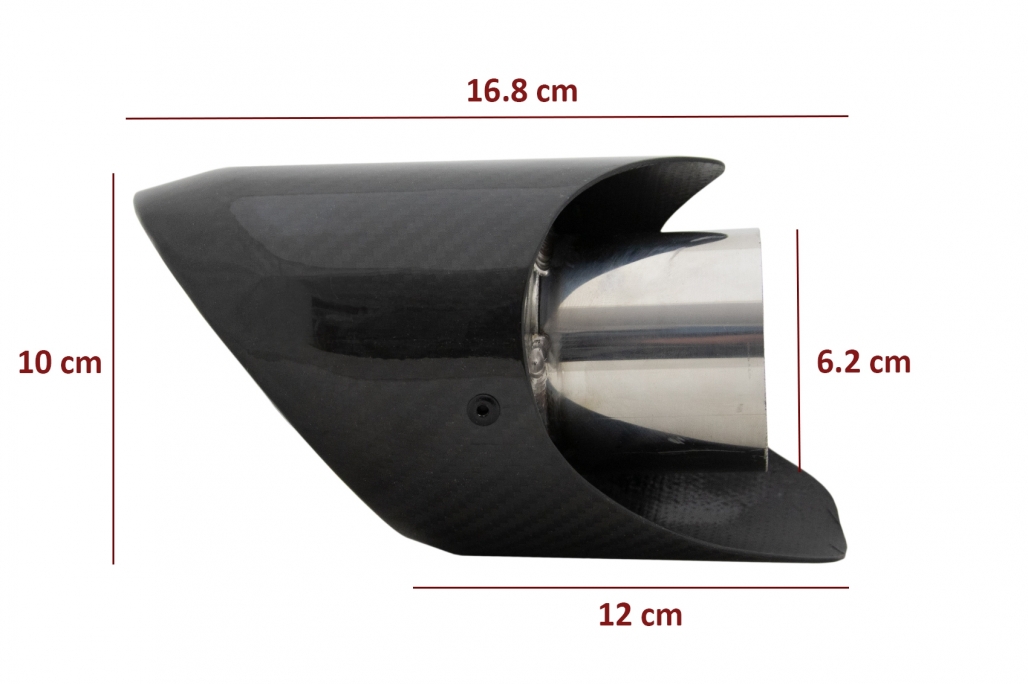 Ornamentul este fabricat din otel inoxidabil 304 si fibra de carbon de cea mai buna calitate. Dimensiuni: Orificiu de admisie: 6.2cm Iesire: 10cm Lungime: 16.8cm