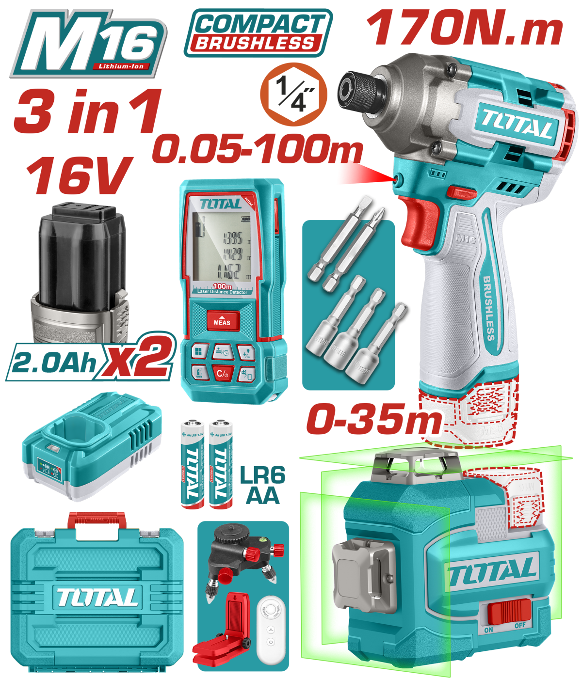 TOTAL - KIT COMBO 16V - MASINA DE INSURUBAT, TELEMETRU LASER, NIVELA LASER (NU INCLUDE ACUMULATOR) PowerTool TopQuality