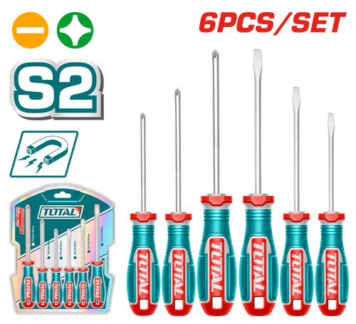 Setul de surubelnite TOTAL, compus din 6 piese, este perfect pentru orice mester sau pasionat de bricolaj, oferind o gama variata de surubelnite pentru diferite tipuri de insurubari. Fiecare surubelnita este realizata din material S2, cunoscut pentru rezistenta sa superioara si durabilitate, iar manerul ergonomic tricolor asigura o prindere confortabila si control sporit.