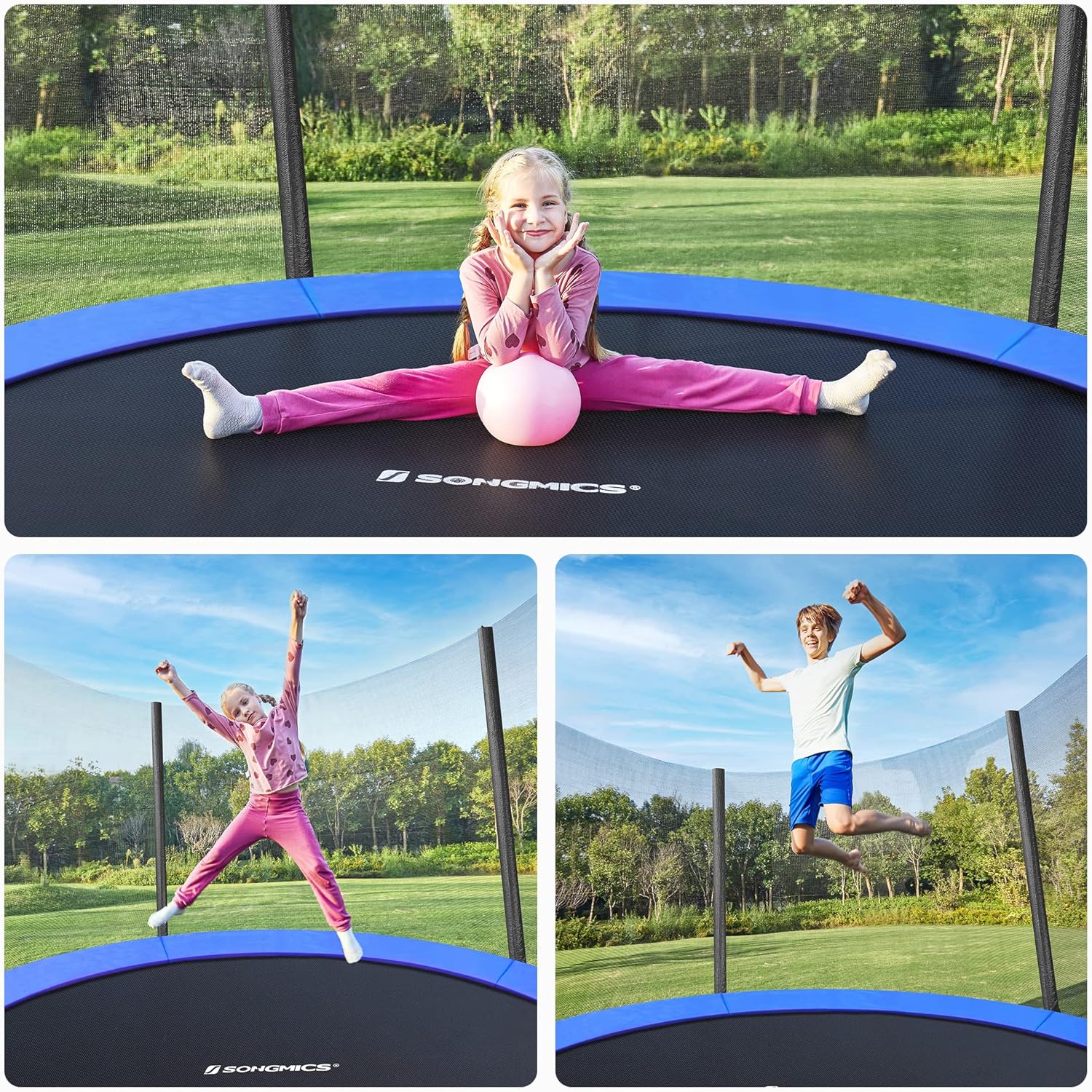 Ofera celor mici ore intregi de distractie in aer liber cu aceasta trambulina pentru copii SONGMICS, conceputa pentru joaca activa si sigura in gradina. Cu un diametru de 183 cm, plasa de protectie exterioara, cadru solid din otel si margine captusita peste arcuri, modelul este potrivit pentru sarituri stabile si confortabile. Designul in nuante de albastru si negru se integreaza usor in orice spatiu exterior, iar structura durabila este gandita pentru utilizare frecventa.