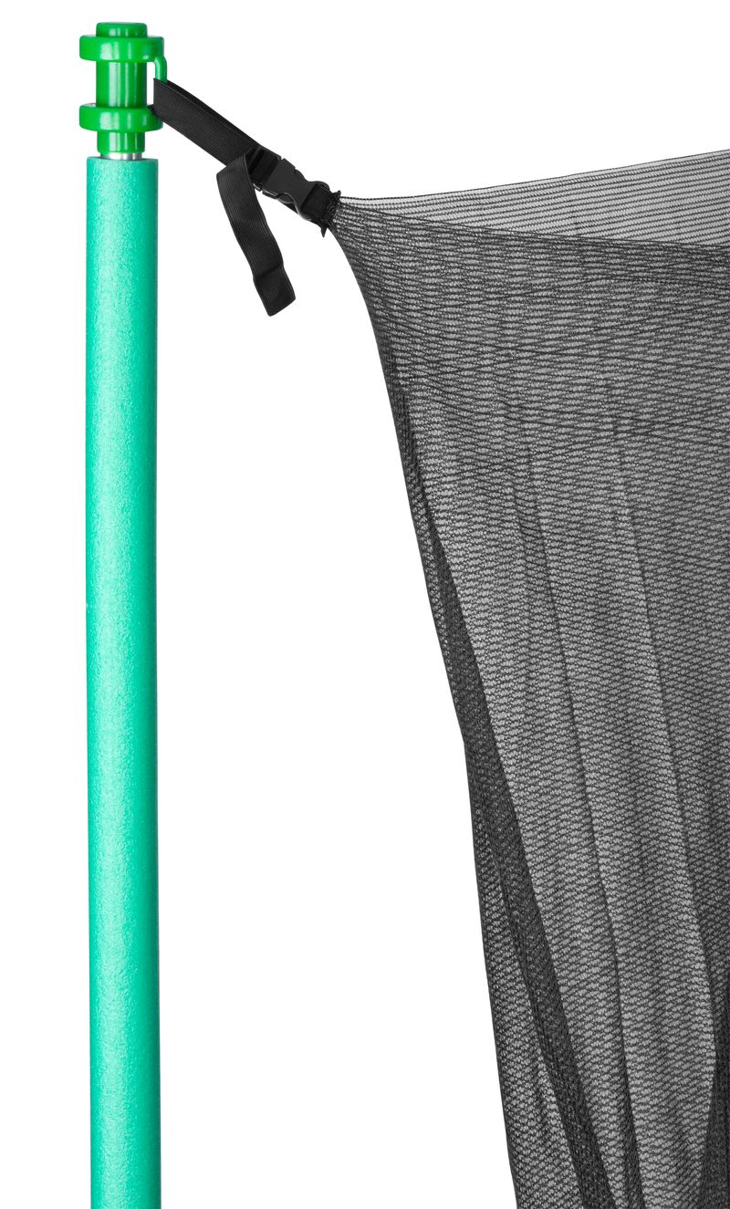 Suprafata de sarit este realizata din polipropilena rezistenta, iar cadrul solid din otel calit contribuie la o buna stabilitate si la rezistenta in timp. Protectiile din spuma amplasate pe stalpi si peste arcuri ajuta la utilizarea in conditii mai sigure, in timp ce plasa interioara reduce riscul de cadere in afara zonei de sarit.