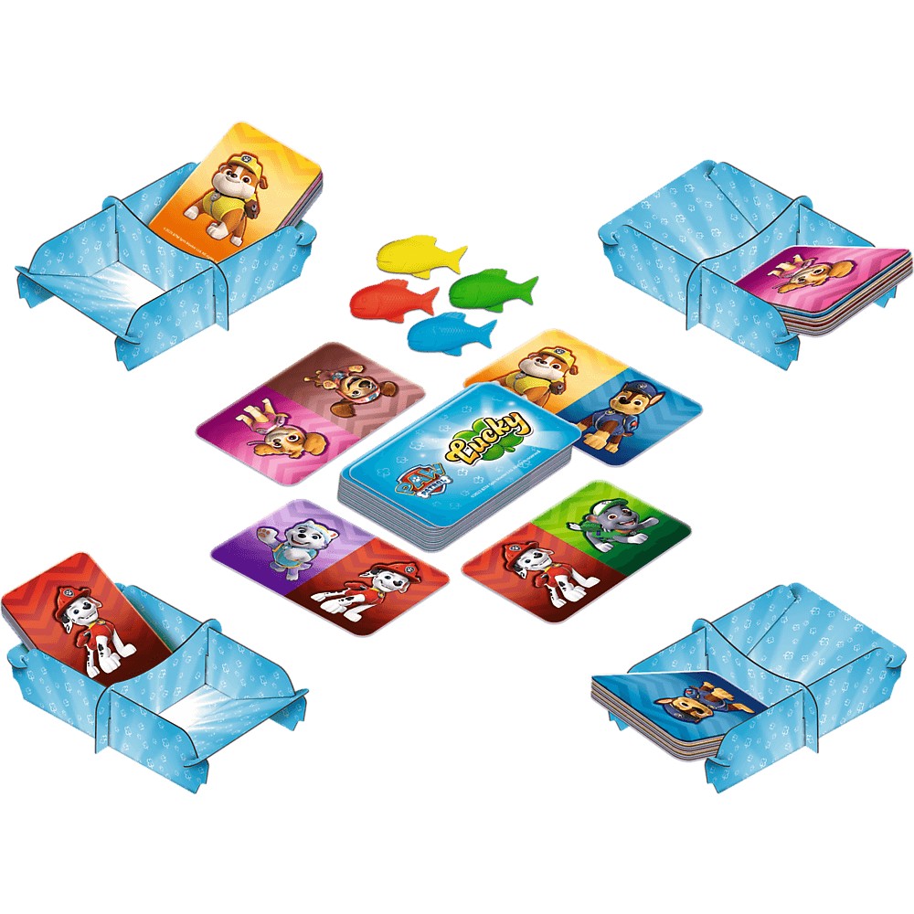 Un joc nebun din seria Lucky, cu personajele tale preferate din desenul animat Paw Patrol Toata lumea isi da unul altuia cartile de personaj in acelasi timp pentru a strange cat mai repede 7 seturi de carti de gol! Fii vigilent - pestele cauciuc iti poate grabi drumul catre victorie. De indata ce observati simbolurile lor pe o carte cu fata in sus, incercati sa le prindeti inainte ca altii! Asezi o carte selectata din mana ta in containerul din stanga ta si apoi trageti o carte din containerul din dreapta. Puneti cartea cu fata in sus (cu acelasi caracter pe ambele parti). Fiecare face aceasta miscare in acelasi timp, fiecare in ritmul sau. Nu poti avea niciodata mai mult de 5 carti de caractere in mana. Daca acesta este primul tau joc, exerseaza de mai multe ori miscarea de mai sus.