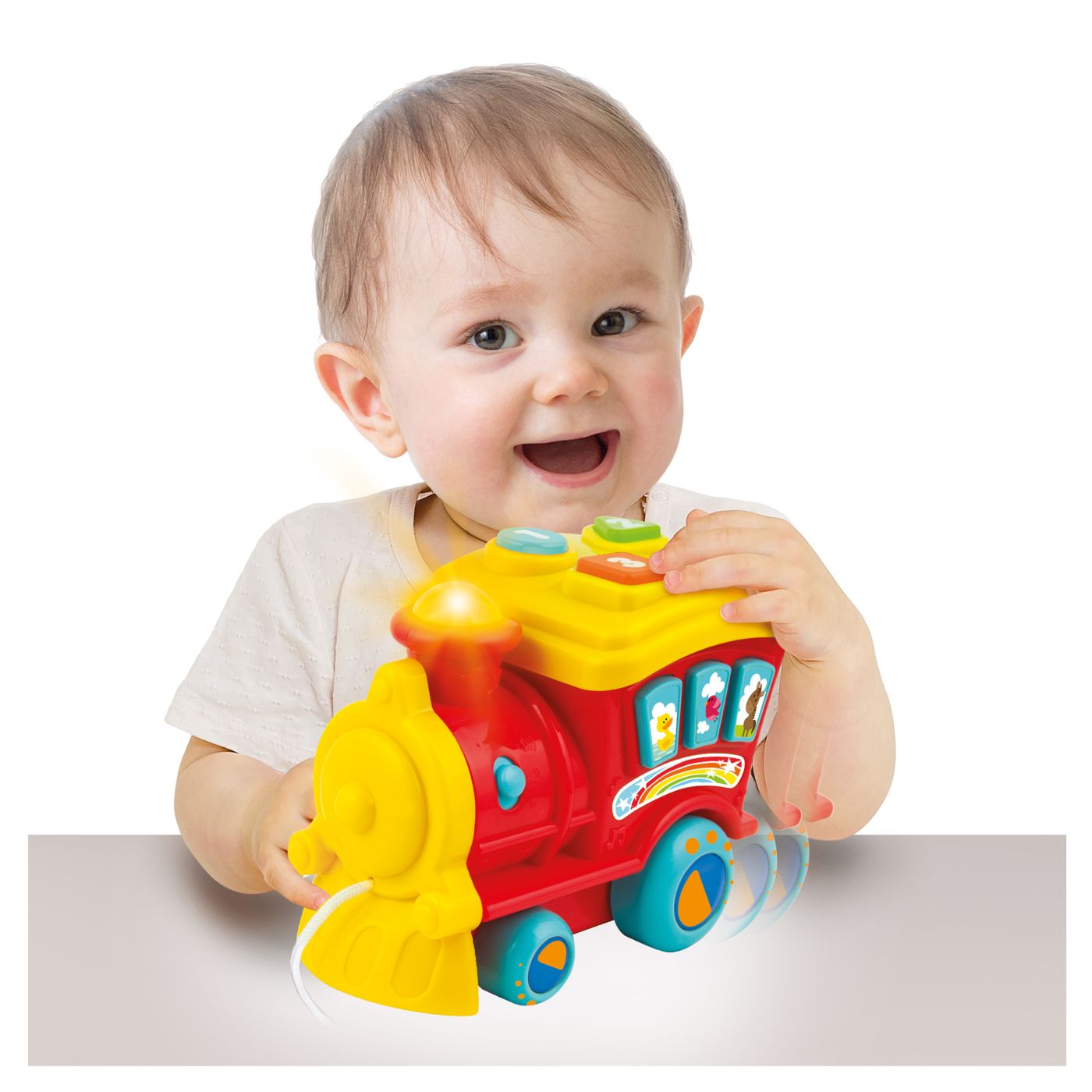 Mod de utilizare: copilul poate trage trenulețul pentru a activa jocul și poate apăsa butoanele numerotate sau cele cu animale pentru a descoperi sunete, lumini și melodii. Este ideal pentru joacă acasă, în cameră sau în spațiile de joacă.