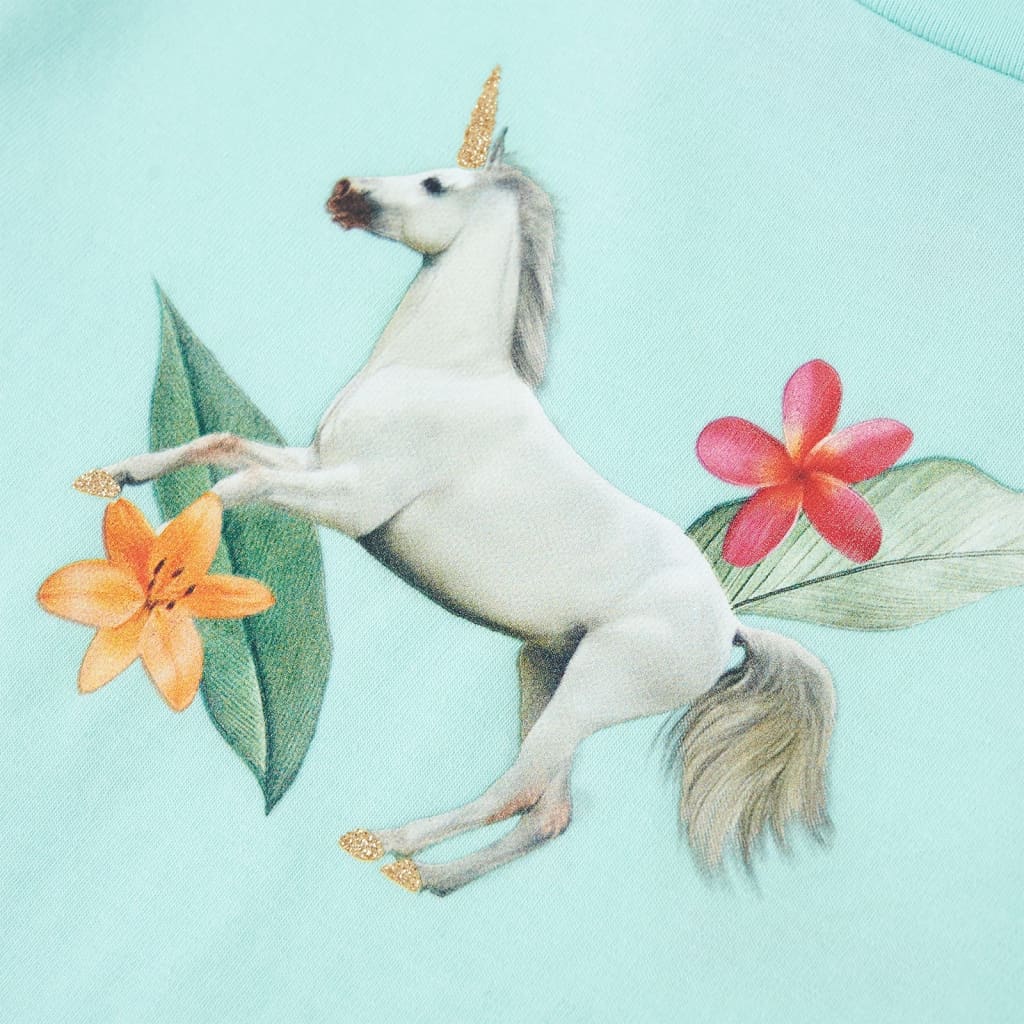 Acest tricou pentru copii are mâneci scurte cu volane, un decolteu rotund și croială dreaptă. Acest tricou pentru copii prezintă un unicorn frumos cu frunze și flori. Tricoul pentru copii cu mânecă scurtă este confecționat din material moale cu 95% bumbac și 5% elastan, pentru confort și respirabilitate.