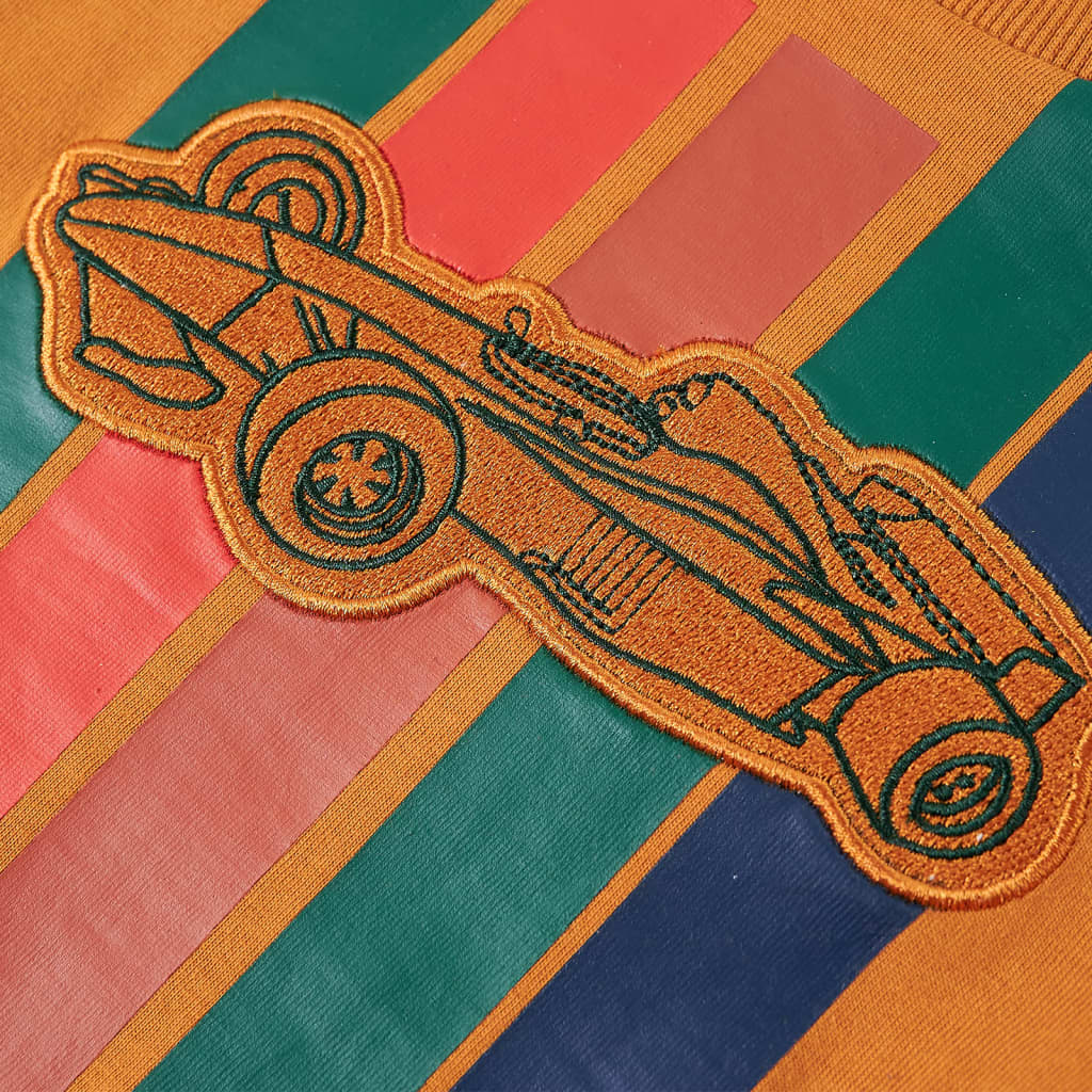 Acest tricou pentru copii are mâneci lungi, decolteu rotund și croială dreaptă. Acest tricou ocru închis prezintă o mașină de curse și dungi colorate. Acest tricou pentru copii cu mânecă lungă este confecționat din bumbac 100%, care este tratat cu silicon și enzime prin spălare, pentru o senzație moale și confortabilă.