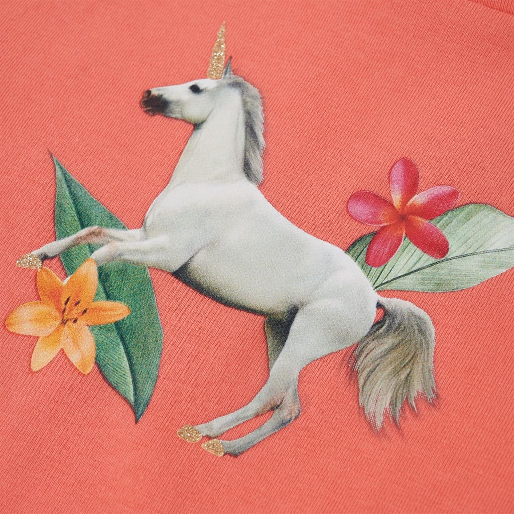 Acest tricou pentru copii are mâneci scurte cu volane, un decolteu rotund și croială dreaptă. Acest tricou pentru copii prezintă un unicorn frumos cu frunze și flori. Tricoul pentru copii cu mânecă scurtă este confecționat din material moale cu 95% bumbac și 5% elastan, pentru confort și respirabilitate.