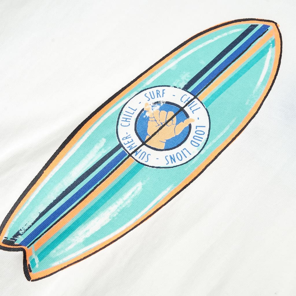 Acest tricou pentru copii are mâneci scurte, decolteu rotund și croială dreaptă. Tricoul pentru copii prezintă o placă de surf colorată pe partea din față. Tricoul pentru copii este confecționat din bumbac 100%, pentru o atingere moale și confortabilă.