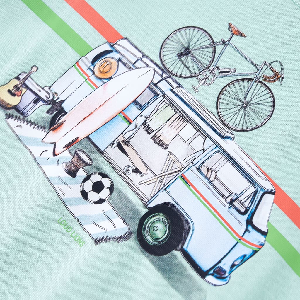 Acest tricou pentru copii are mâneci scurte, decolteu rotund și croială dreaptă. Tricoul pentru copii prezintă un autobuz și alte modele în partea din față. Tricoul pentru copii este realizat din bumbac 100% pentru o atingere moale și confortabilă.