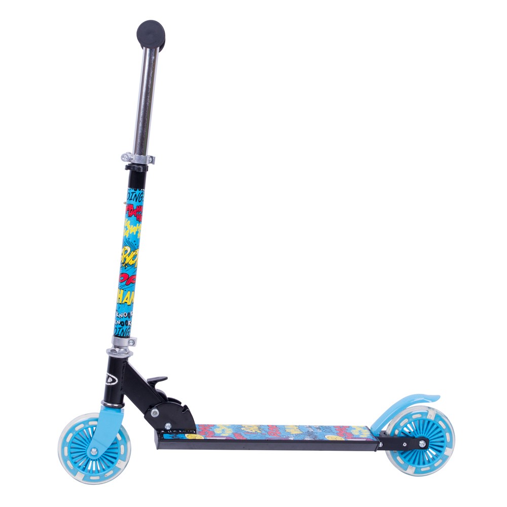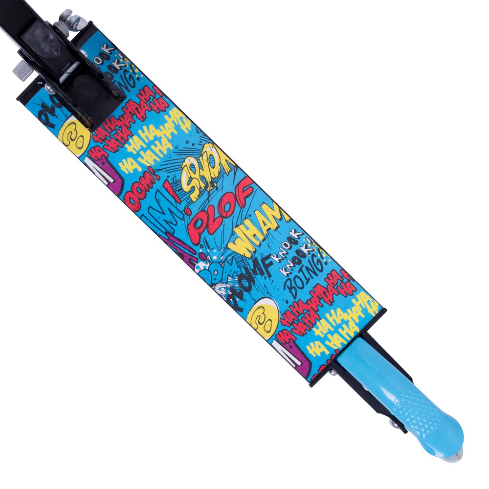 Trotineta WORKER Plofi cu roti iluminate este o trotineta de calitate, realizat din aliaj usor de aluminiu, care are un tub de otel. Datorita mecanismului de pliere simplu, blocabil, il puteti transporta. Are roti care se aprind la rotire. Cu toate acestea, nu sunt necesare baterii, deoarece diodele sunt alimentate cu energie electromagnetica. Rotile iluminate creeaza astfel un joc colorat de lumini rosii sub platforma. In afara de efectele de lumina, trotineta se deosebeste prin designul atractiv de benzi desenate (comics). Caracteristicile de siguranta, cum ar fi manerele de ghidon acoperite de spuma, platforma antiderapanta si frana din spate nu numai ca ofera caracteristici excelente de calatorie, dar, de asemenea asigura siguranta copilului in orice moment. Trotineta WORKER Plofi cu roti iluminate este potrivita pentru copii cu varsta de peste 4 ani.